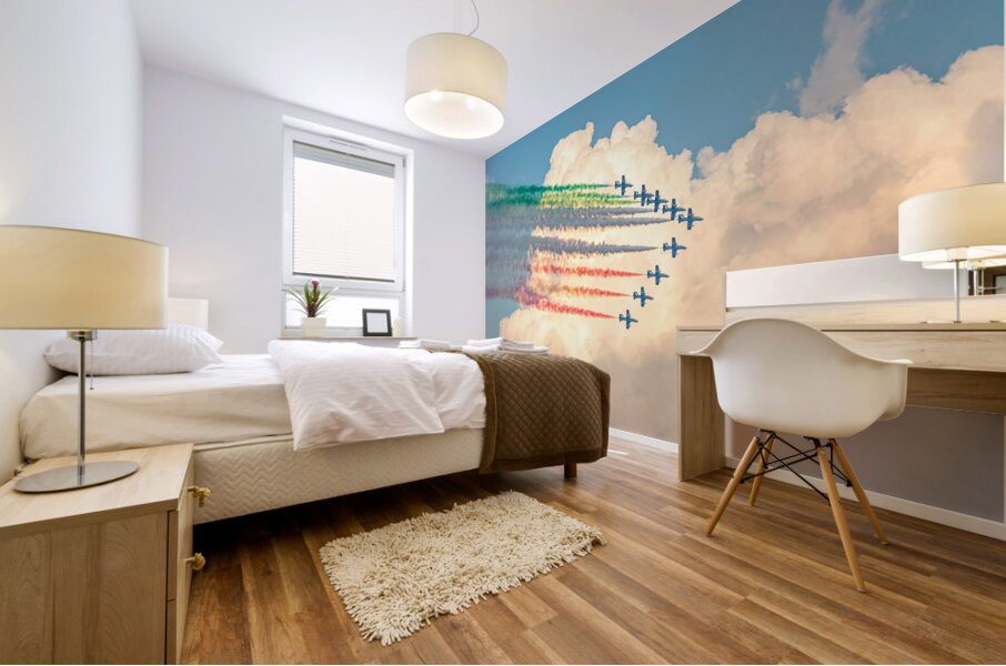 ABOUT THIS ARTWORK: FIGHTER JETS PERFORMING AIRSHOW WITH COLORFUL EXHAUST STREAMS IN SCENIC CLOUDS