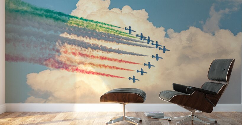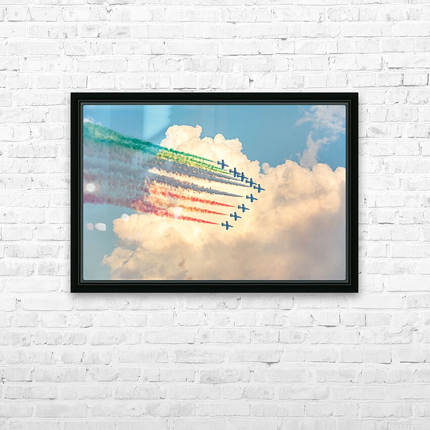 Fighter jets performing airshow with colorful exhaust streams in scenic clouds Wall Decor Frame