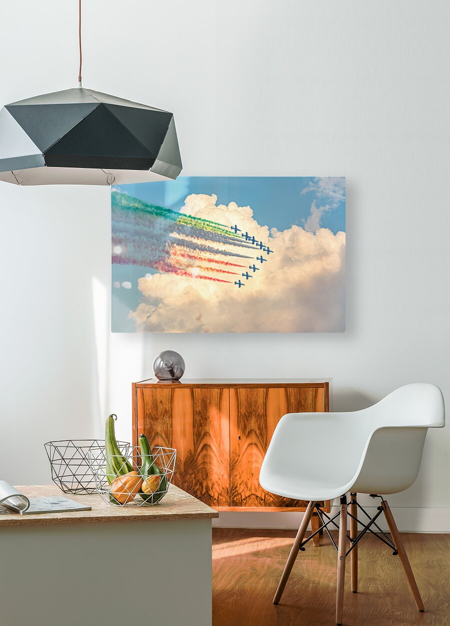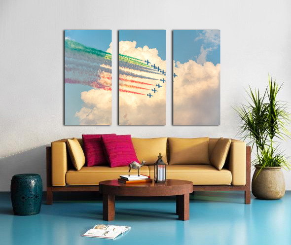 FIGHTER JETS PERFORMING AIRSHOW WITH COLORFUL EXHAUST STREAMS IN SCENIC CLOUDS CALADOART  Canvas Print