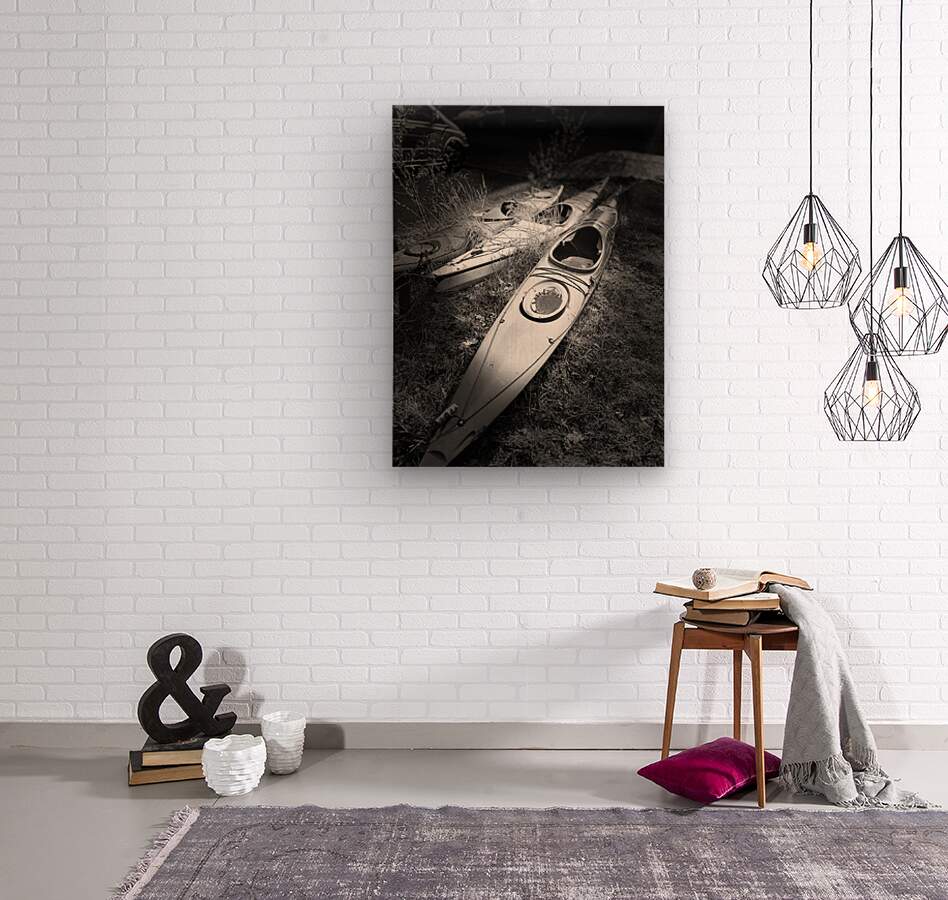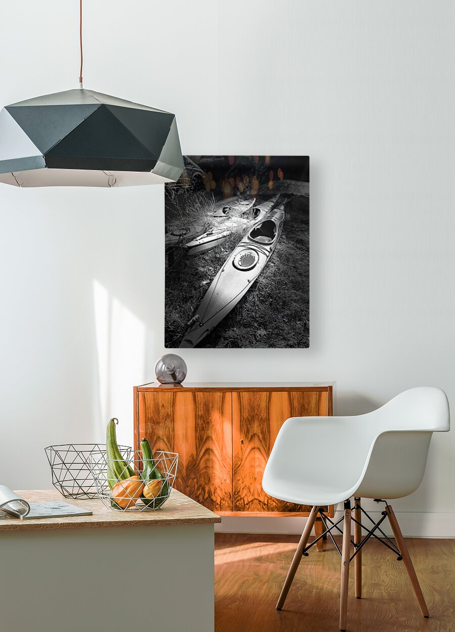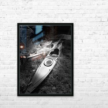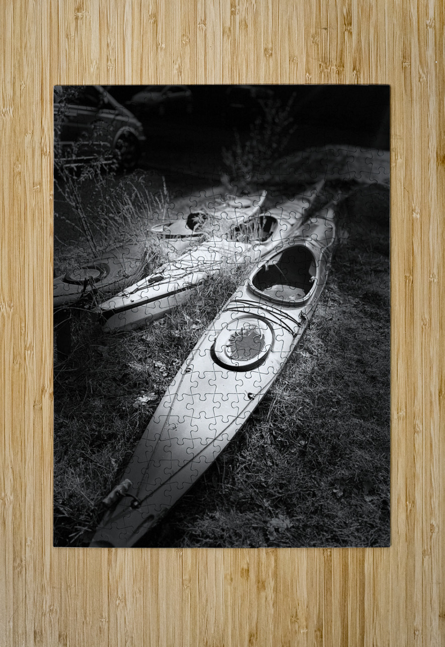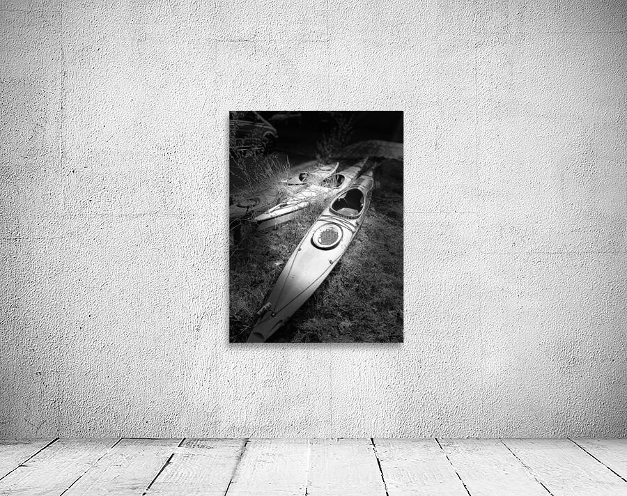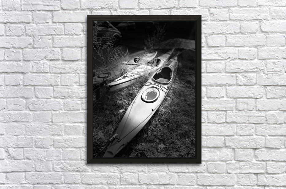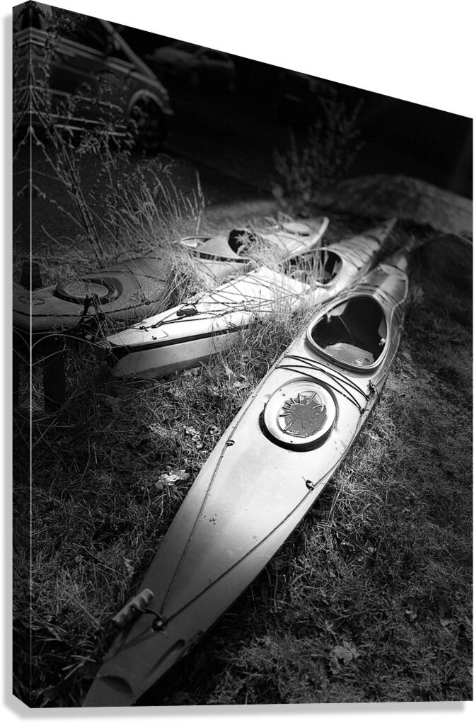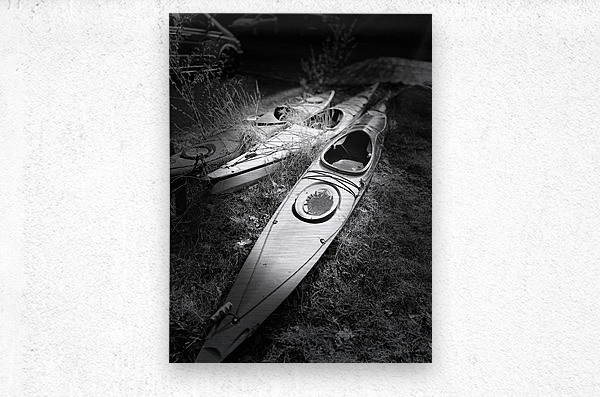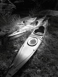 A black and white photo featuring a row of kayaks resting on the grass, partially illuminated by dappled sunlight. Tall grass and a parked car are vis...[+]