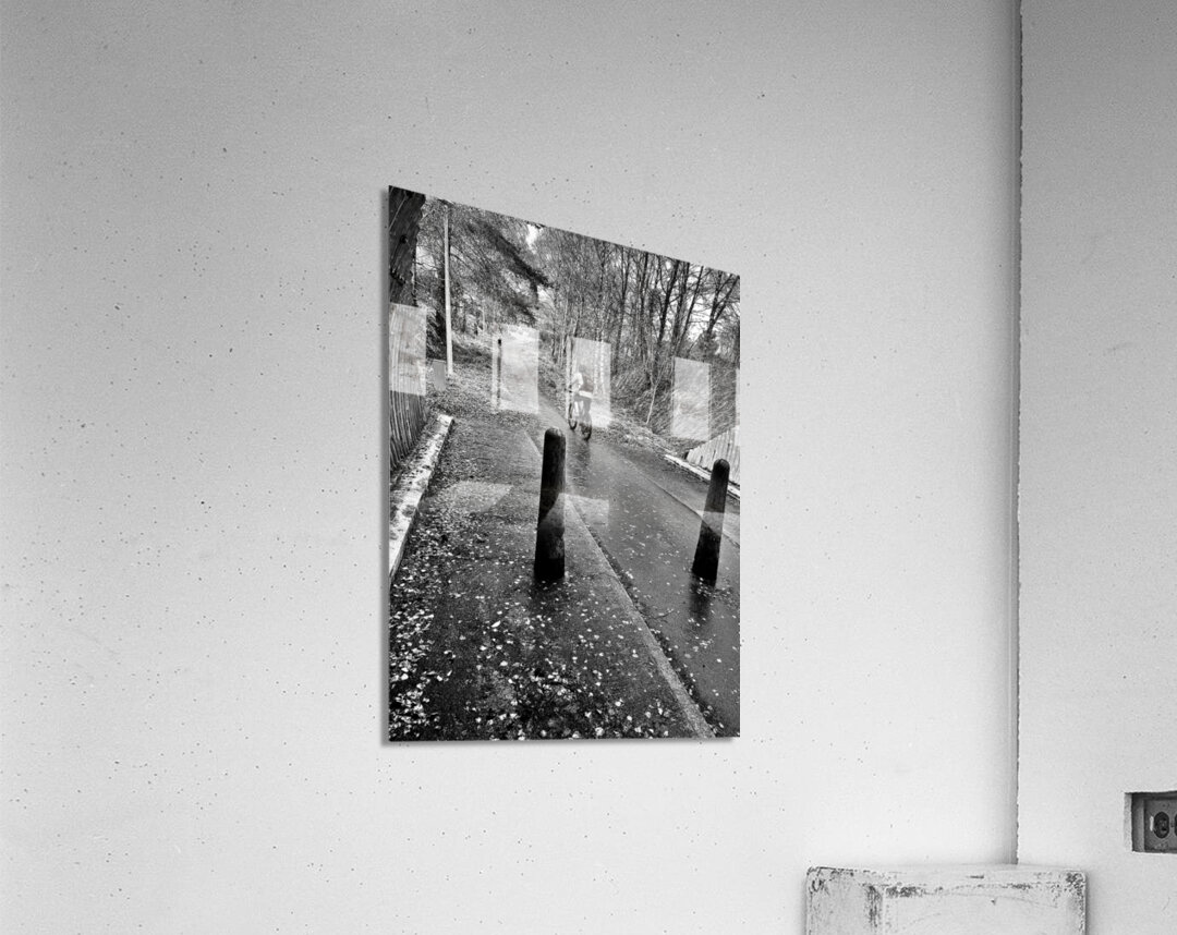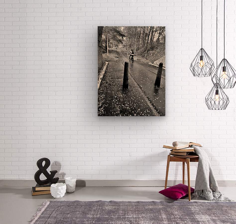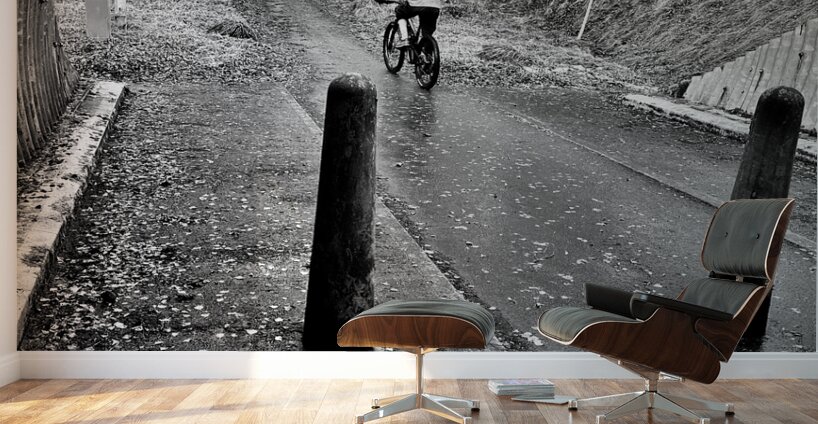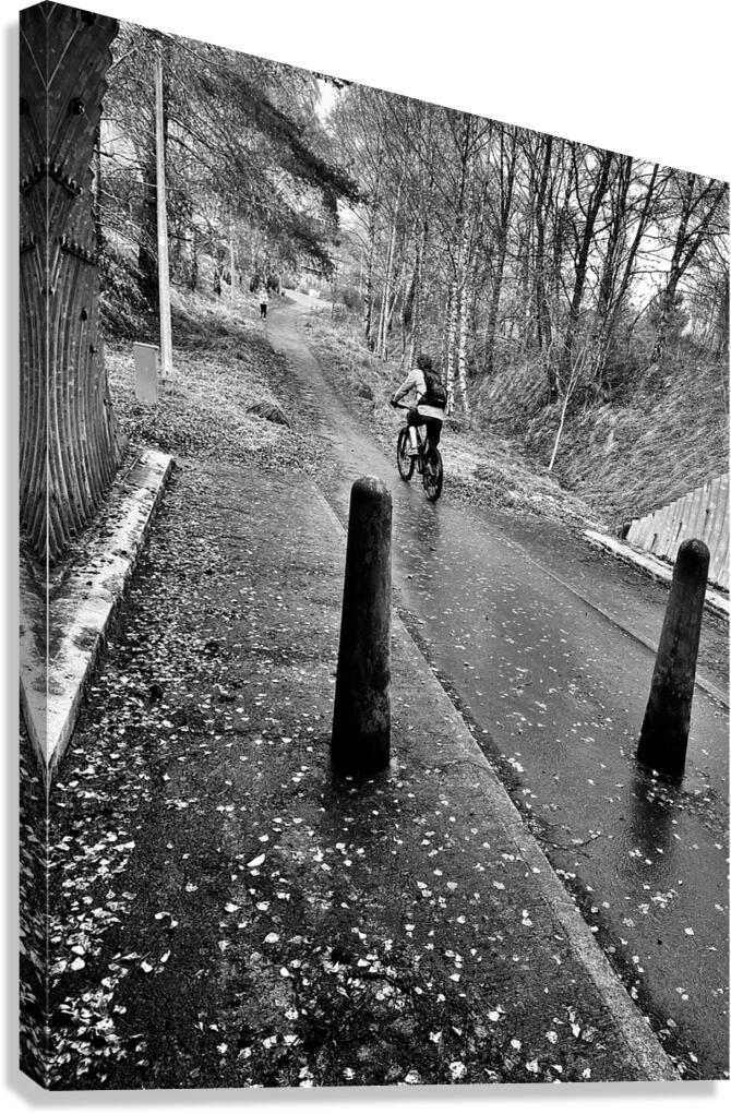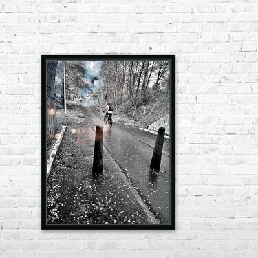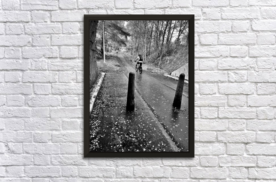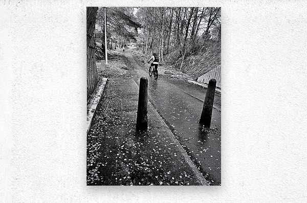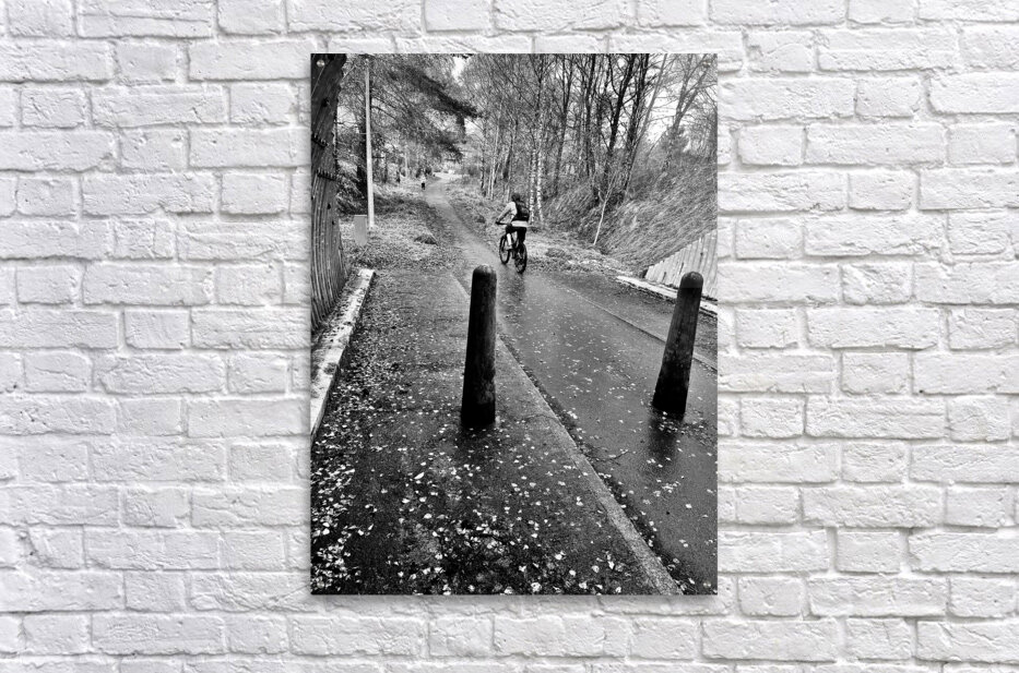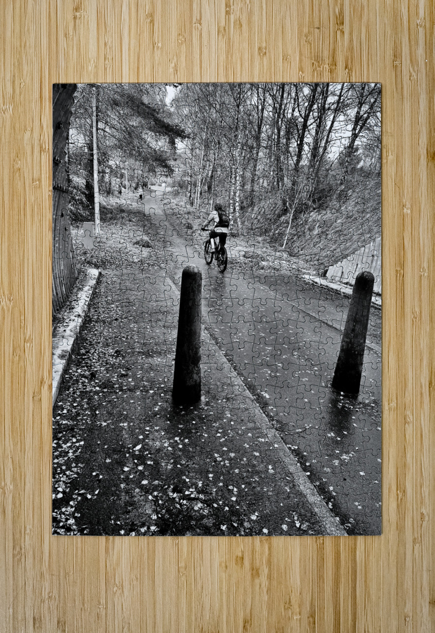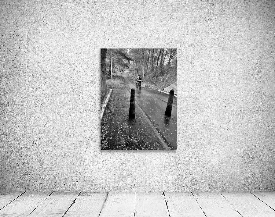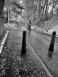 A black and white photo featuring a cyclist riding along a damp, leaf-strewn path through a wooded area in autumn. The black and white tones create a ...[+]