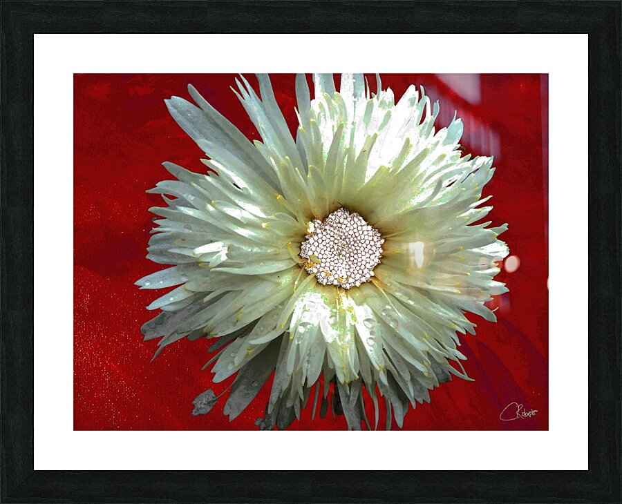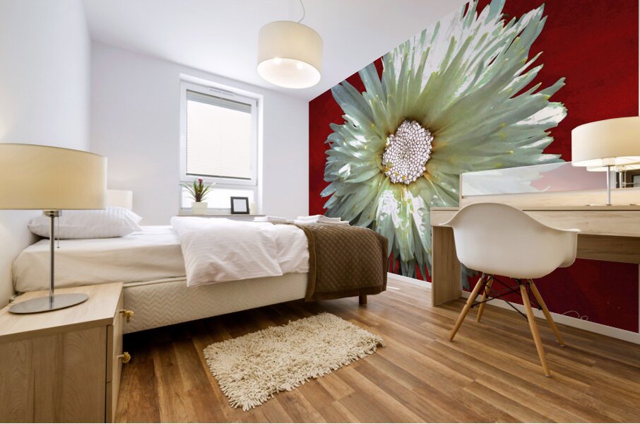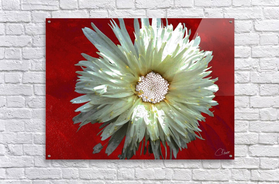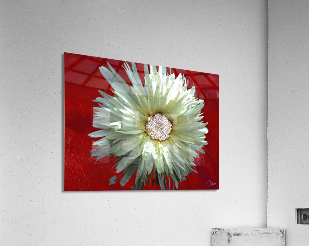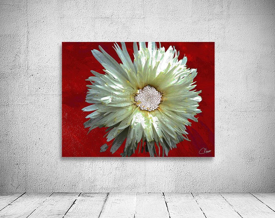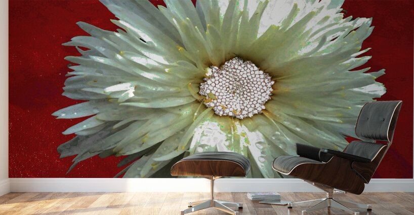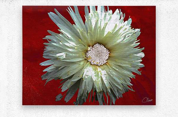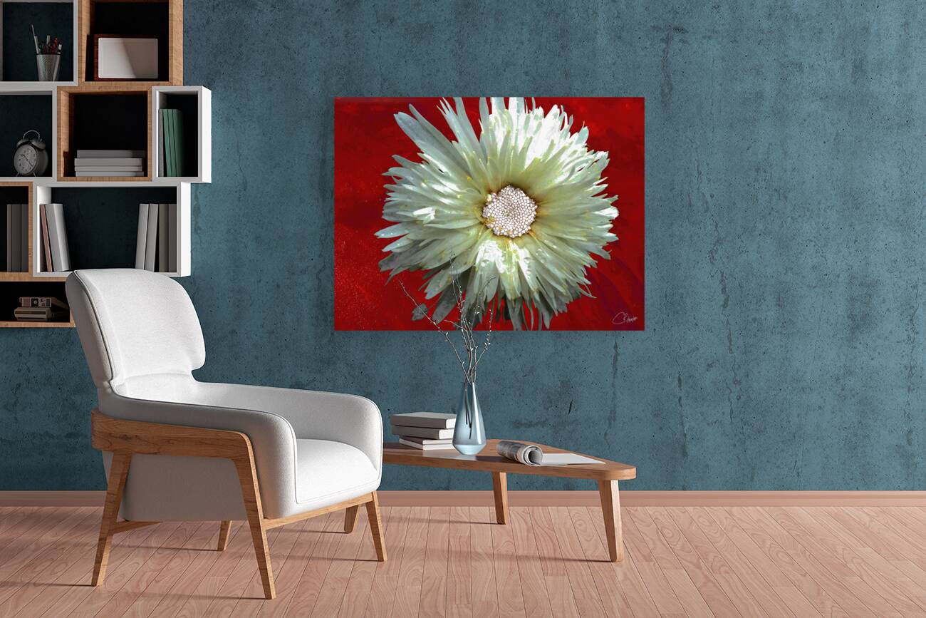 Once a close up photo of a Daisy flower and a hand painted acrylic, laterally digitally combined and manipulated to create a stunning piece of floral contemporary art. Features a captivating white Daisy with intricate petal details set against a vivid red background, creating a striking contrast. The flower's center is highlighted by small white spherical elements.