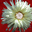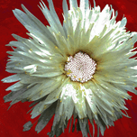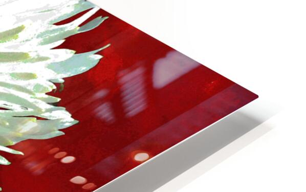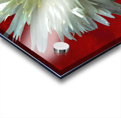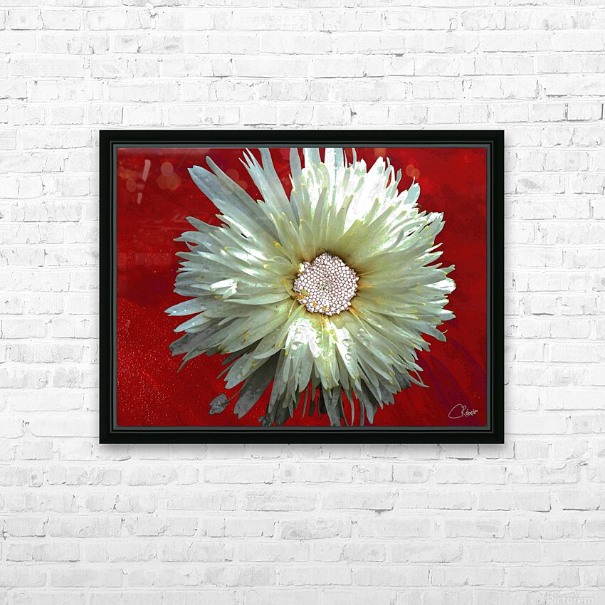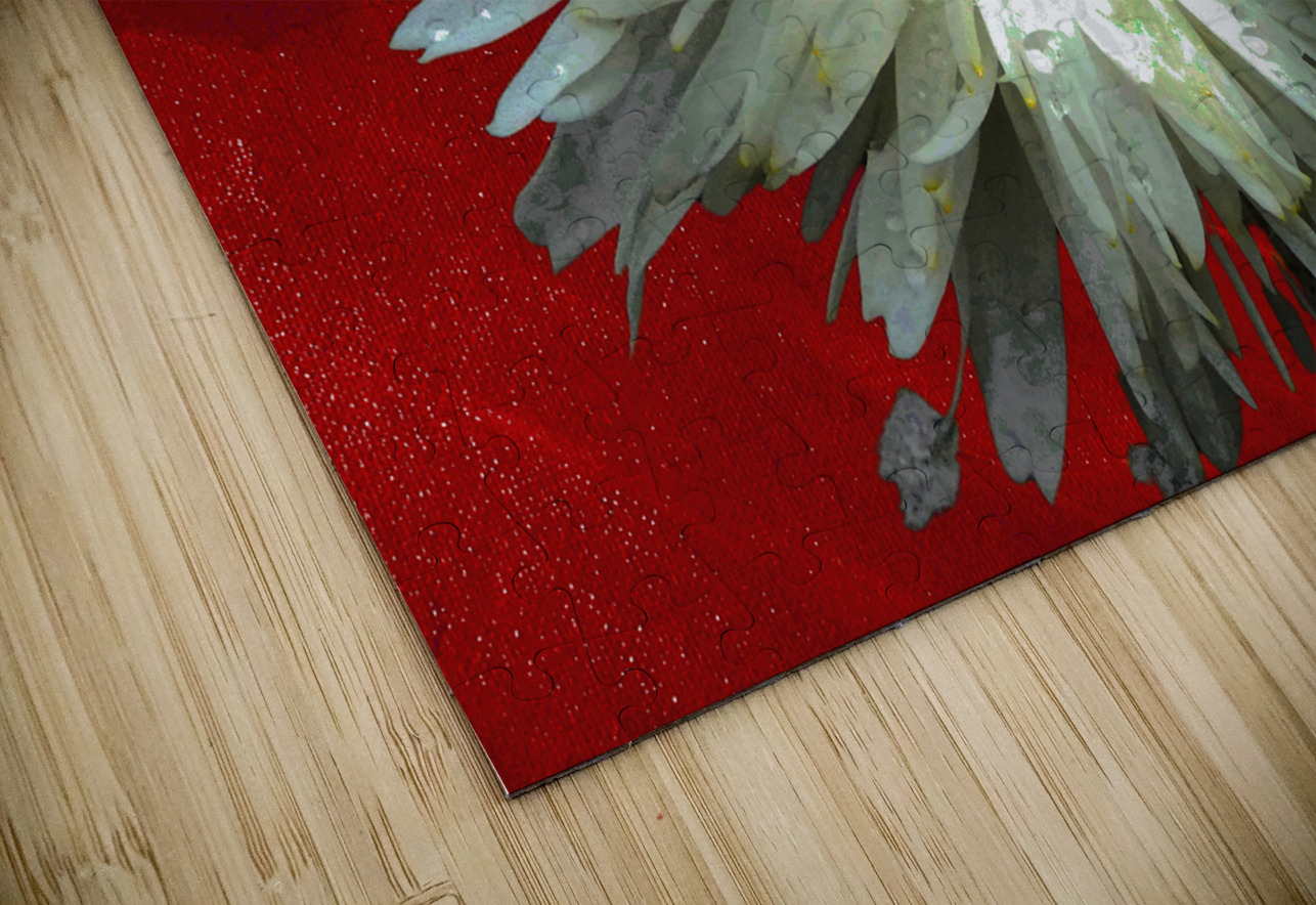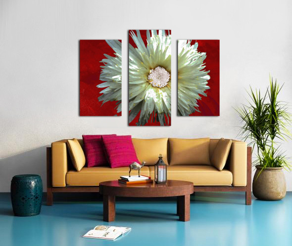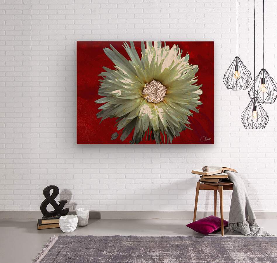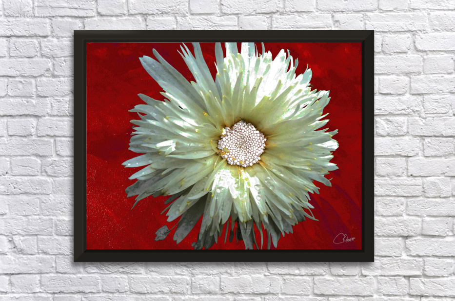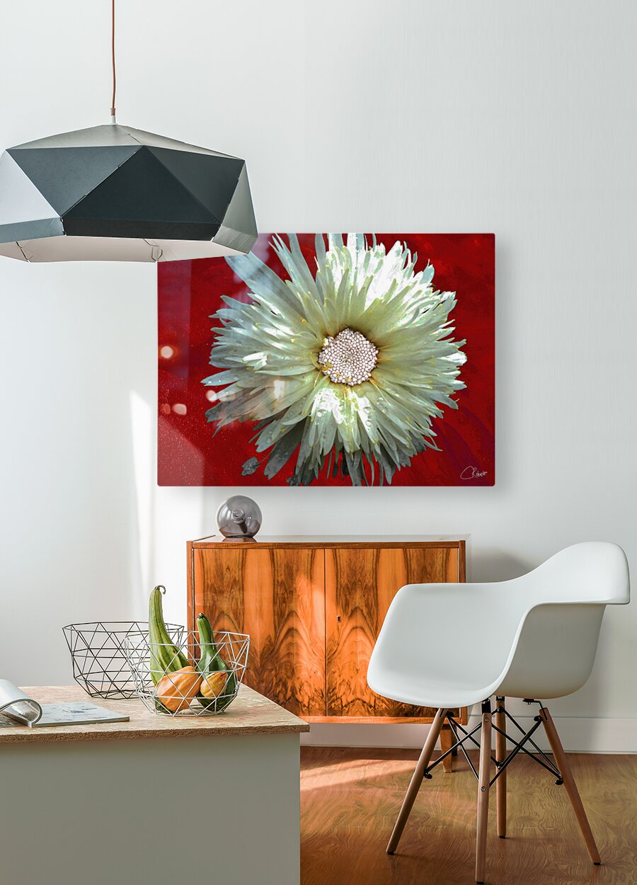 Once a close up photo of a Daisy flower and a hand painted acrylic, laterally digitally combined and manipulated to create a stunning piece of floral contemporary art. Features a captivating white Daisy with intricate petal details set against a vivid red background, creating a striking contrast. The flower's center is highlighted by small white spherical elements.