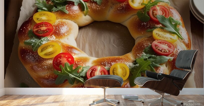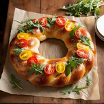 This artwork showcases a beautifully styled artisan bread wreath, designed to captivate both food lovers and visual art enthusiasts. It highlights a golden-brown baked bread in a circular, wreath-like shape, evoking a sense of elegance and festivity. The bread is adorned with vibrant slices of red and yellow tomatoes, fresh arugula leaves, and a light sprinkle of grated Parmesan cheese, adding rich texture and color contrast. The piece is presented on a rustic wooden table, with parchment paper serving as a neutral backdrop. Subtle, scattered fresh herbs enhance the natural and wholesome aesthetic. The use of warm, soft natural lighting creates a cozy, inviting atmosphere, making the artwork perfect for culinary photography, holiday promotions, or decorative food displays.
