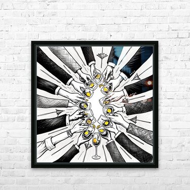 This artwork, titled Cheers in Ink, is a sophisticated black-and-white illustration capturing a moment of celebration. Rendered in an intricate hand-d...[+]