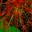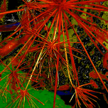 Originally a close up photo of Angelica seed heads, laterally digitally manipulated to create a stunning piece of floral contemporary art. Features vibrant red stems radiate outward, resembling abstract floral or starburst patterns, set against a contrasting background of green and dark blue hues. The composition creates a dynamic interplay of colors and forms, giving the impression of movement and energy.