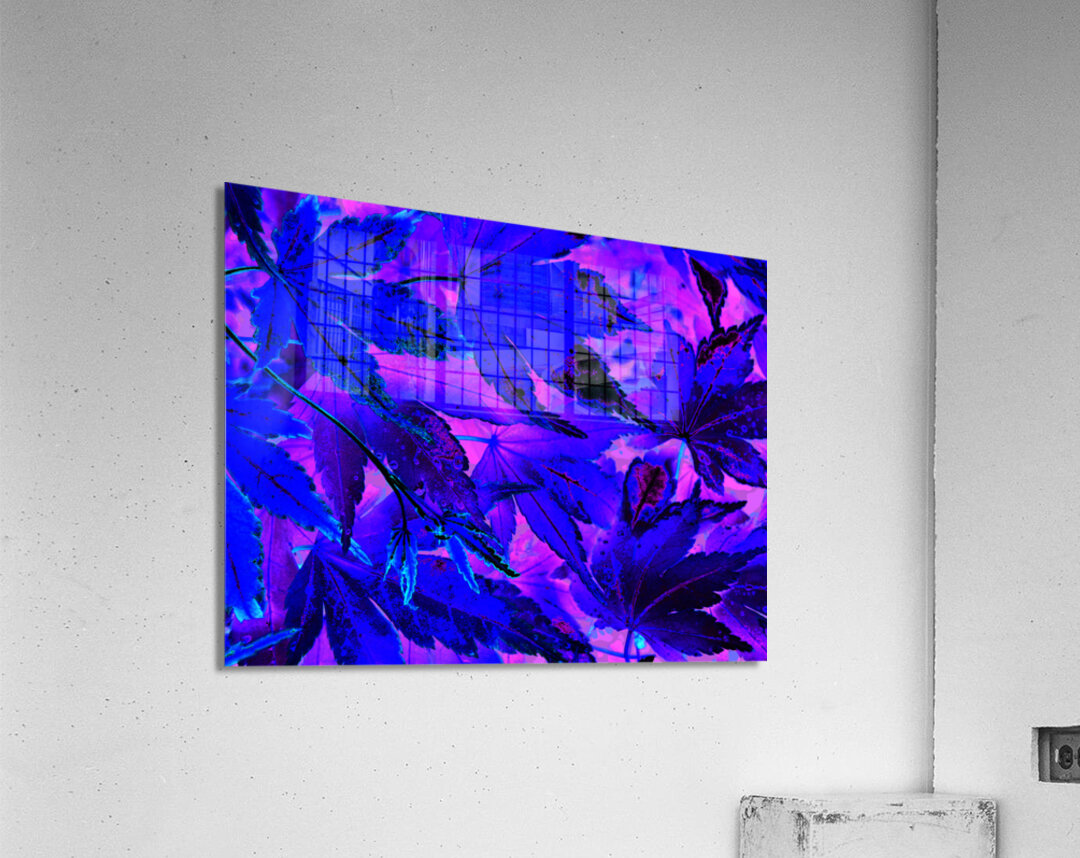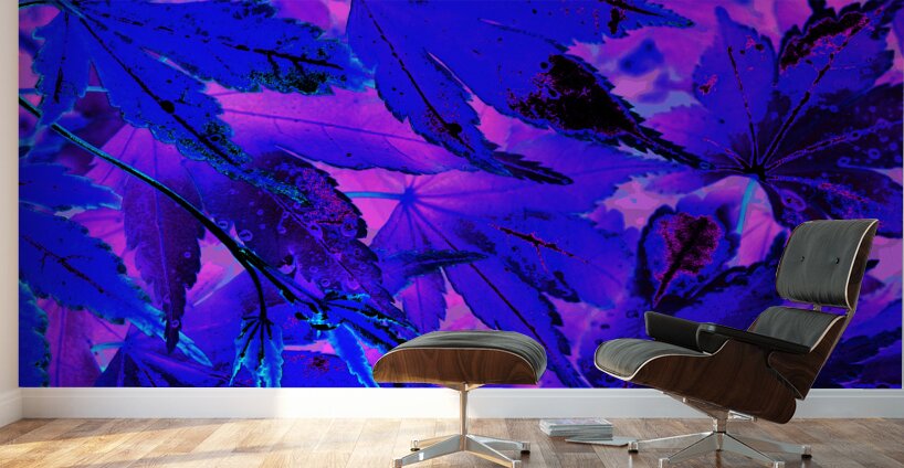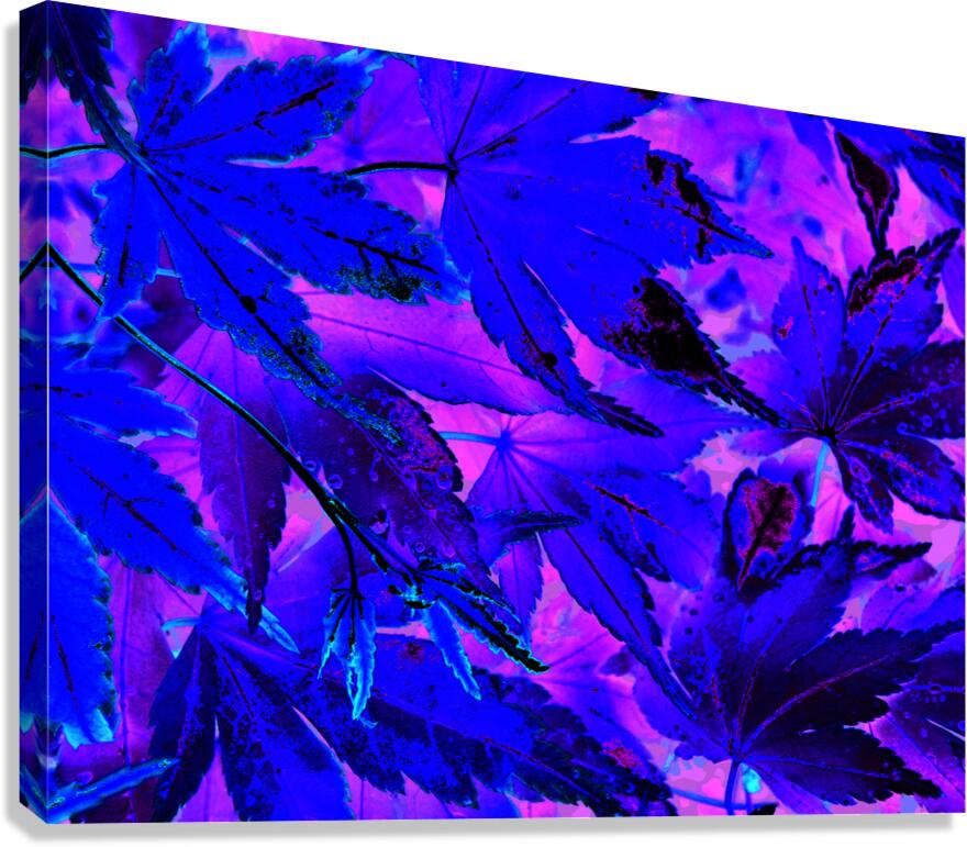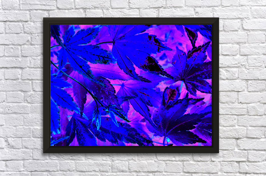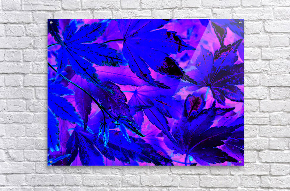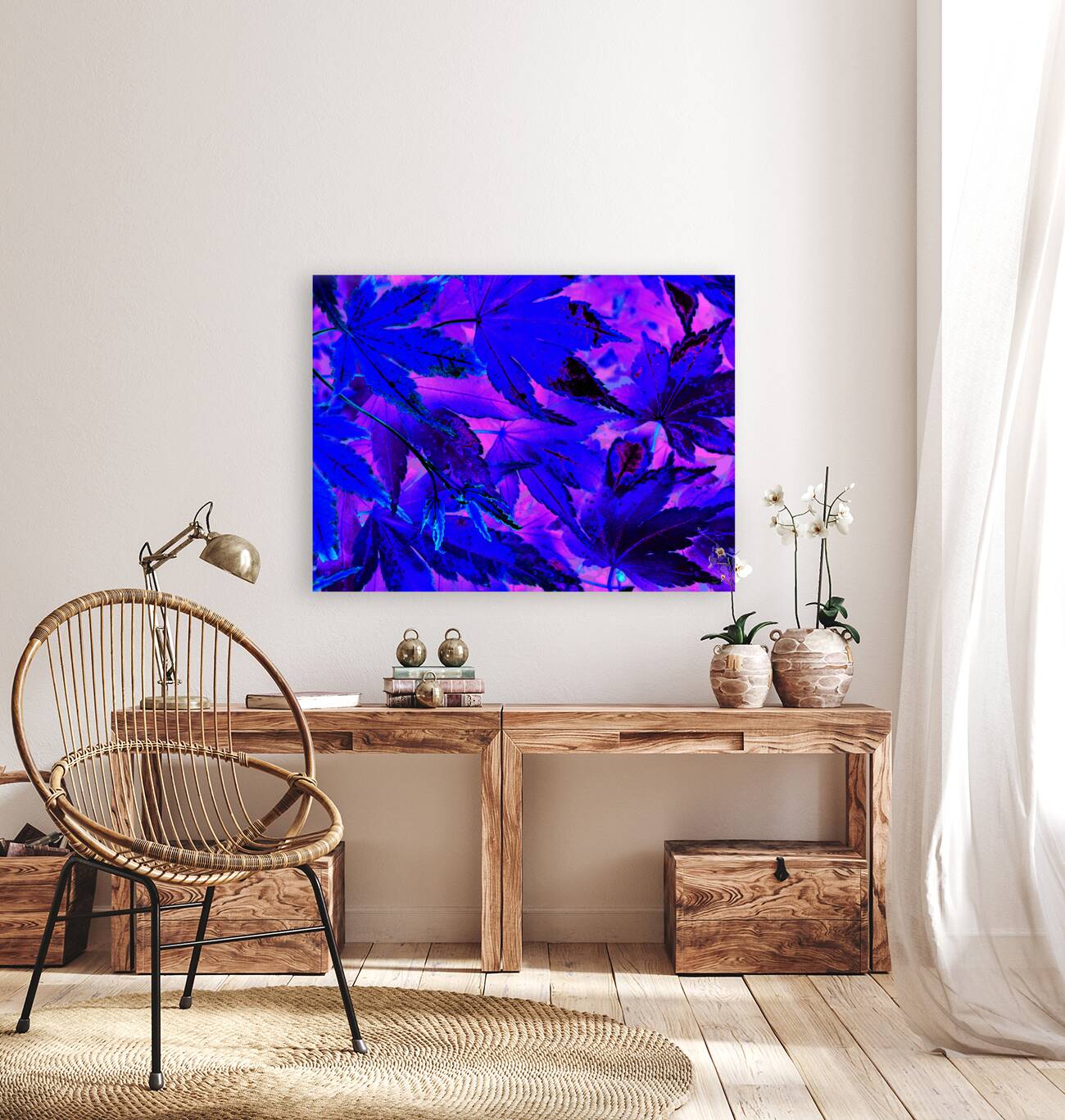 Originally a coloured photo of Acer leaves, laterally digitally manipulated into a stunning piece of botanical contemporary art. Features vivid shades of blue and purple which create a striking contrast on overlapping Acer leaves. The leaves appear almost luminous against the dynamic background, enhancing their intricate patterns.