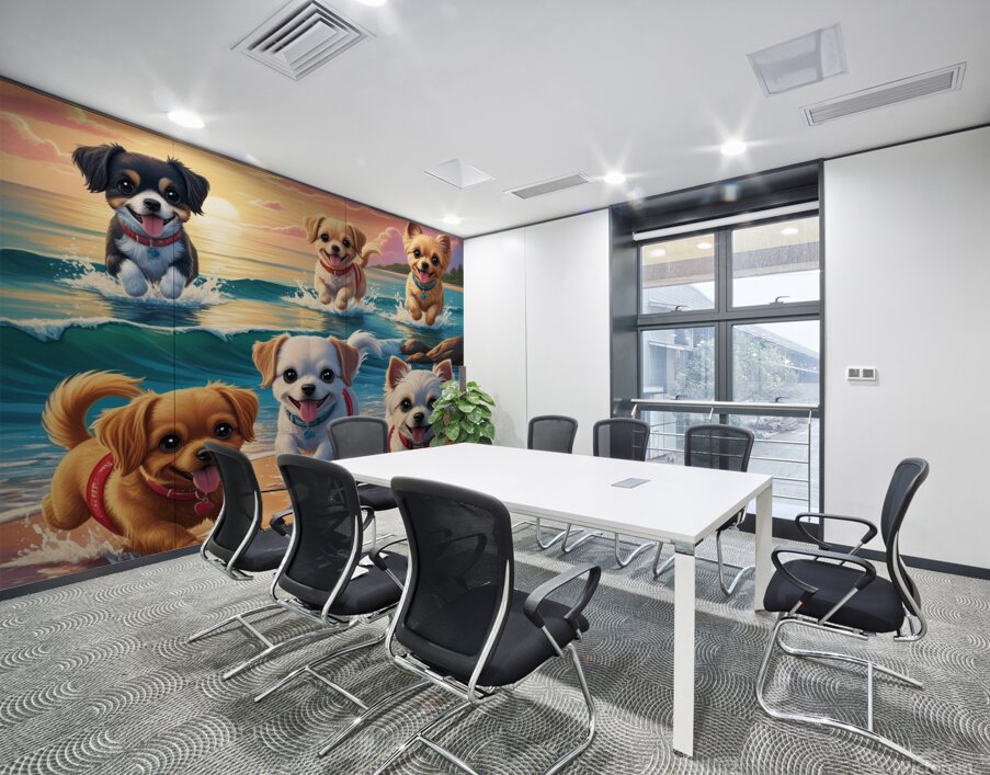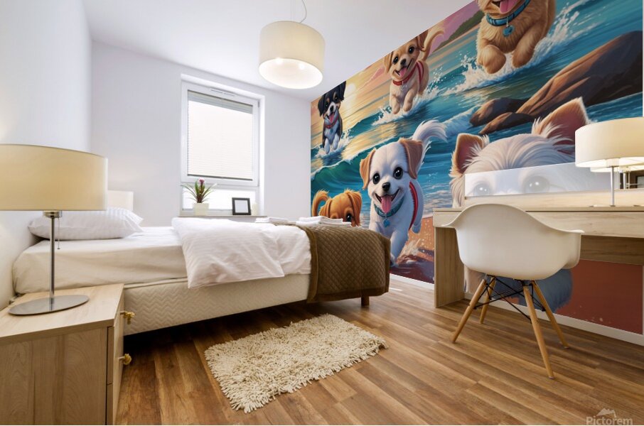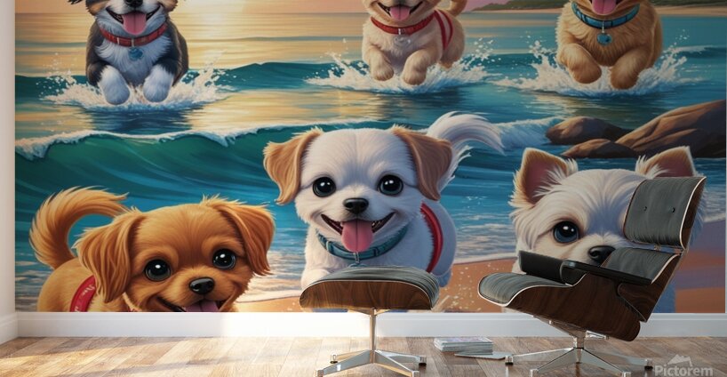 Bring charm and warmth to your space with this vibrant illustration featuring five adorable puppies joyfully running on the beach at sunset. Perfect f...[+]