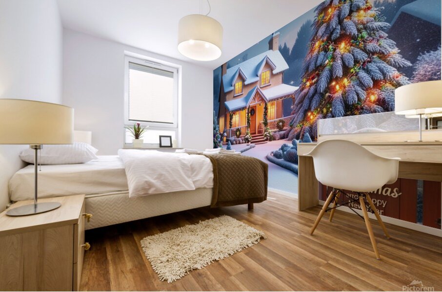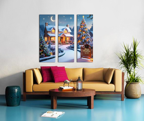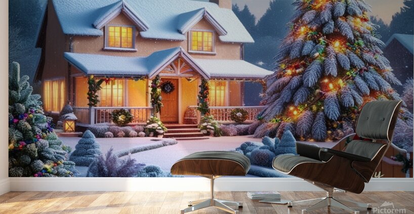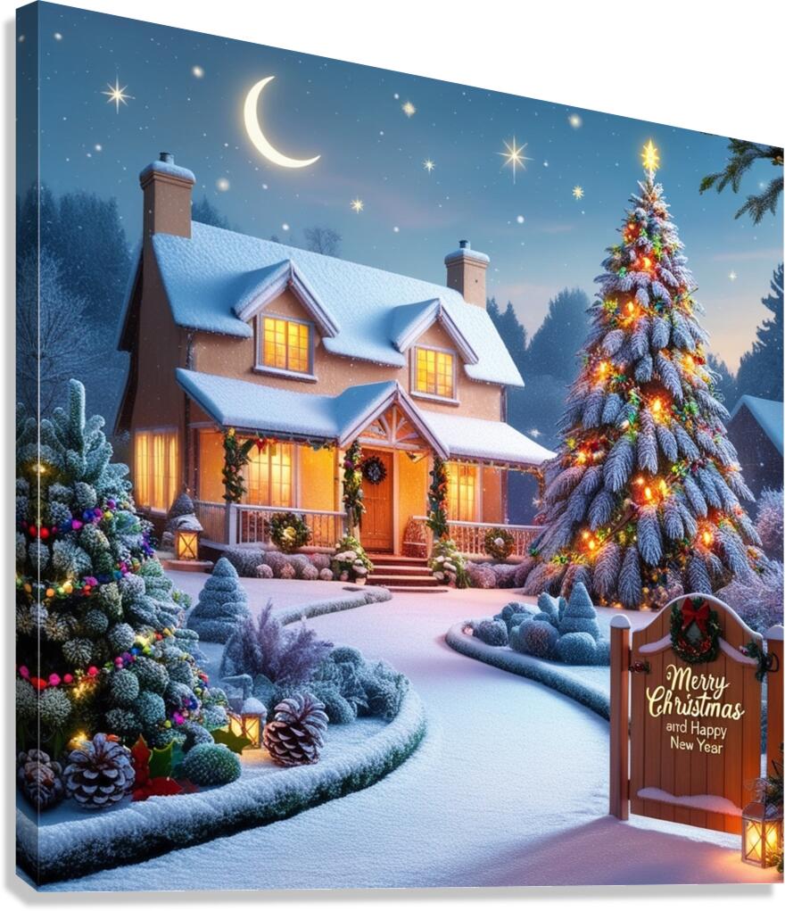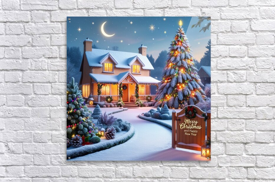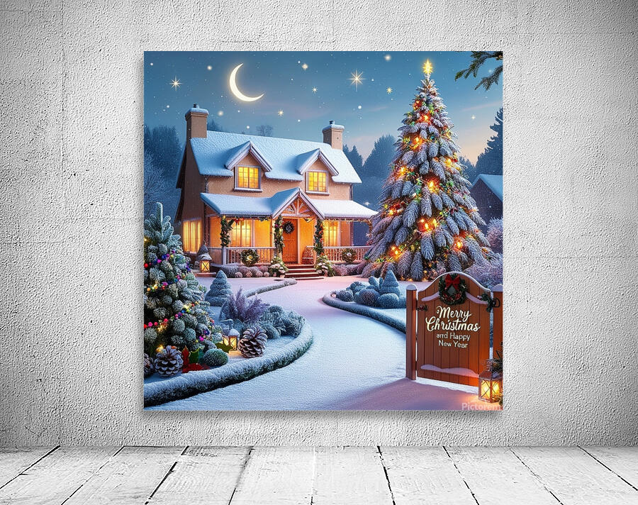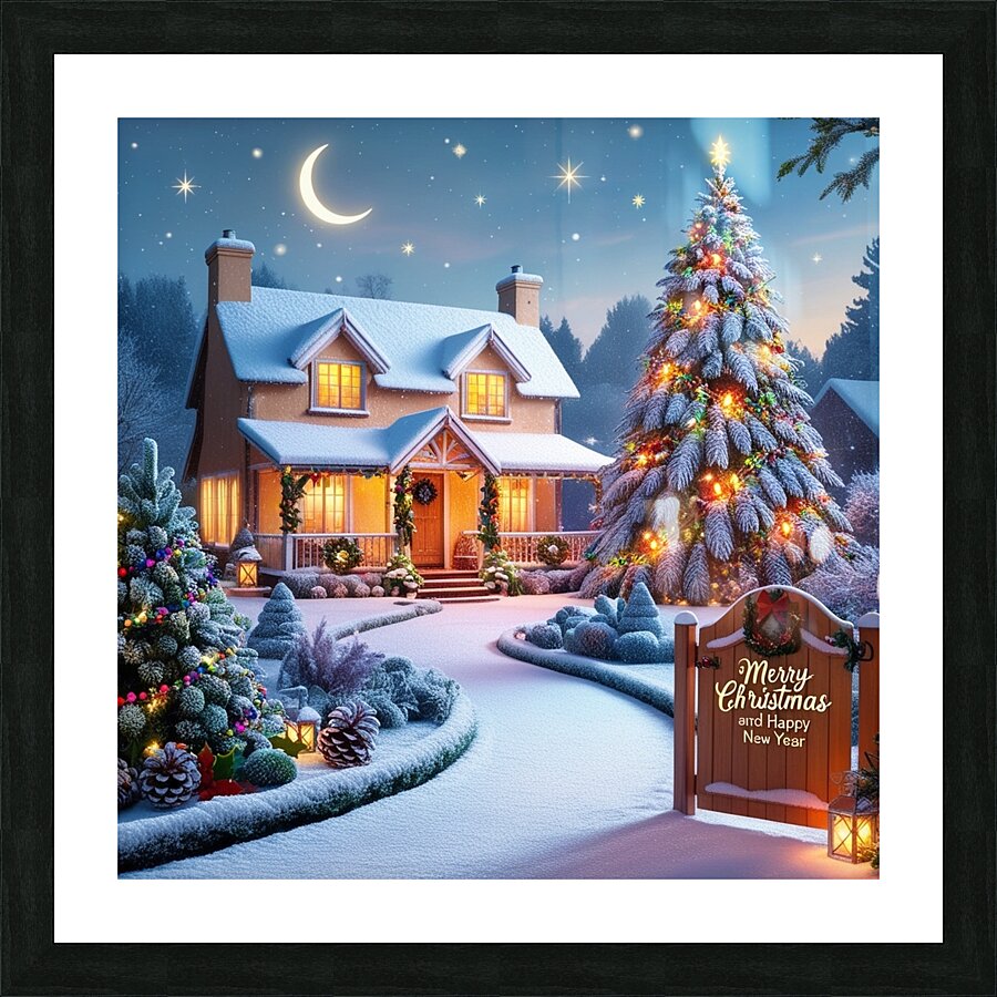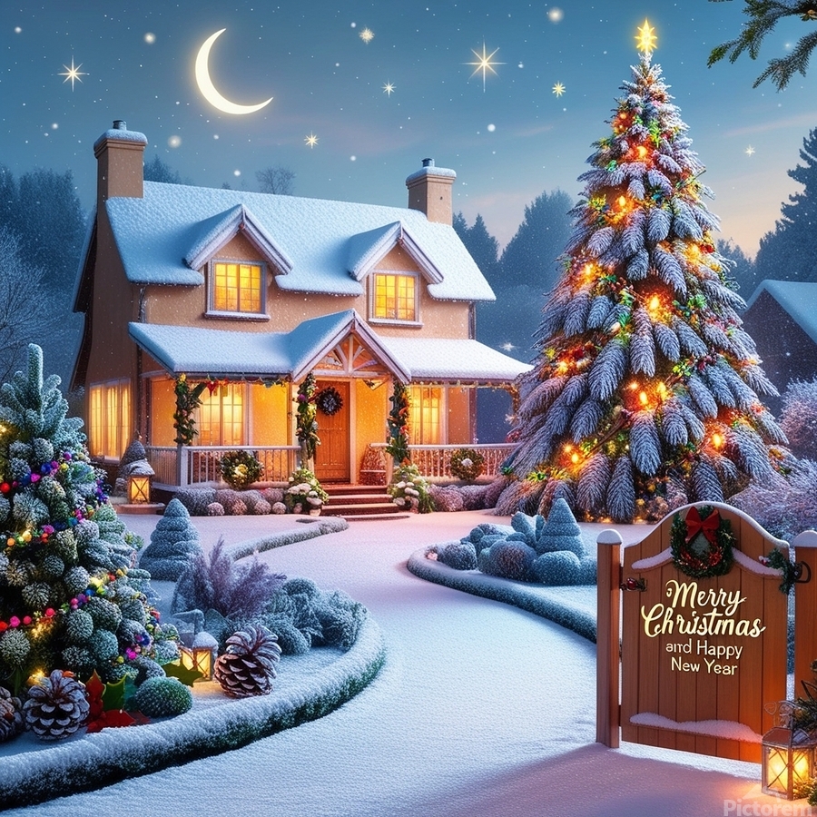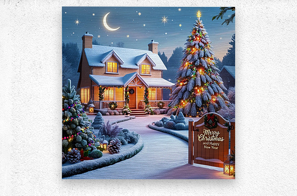 This artwork is a digitally created Christmas scene showcasing a festive and idyllic winter night. Below is an analysis of the key components and style of this artwork: Art Style: Digital Artwork: The image is rendered digitally with high attention to detail, giving it a polished, almost photorealistic appearance. Whimsical and Festive Theme: The bright lights, snowy textures, and warm tones create a joyful and magical holiday aesthetic. Main Features: Cozy House: The central element is a warm, snow-covered house with glowing windows, evoking a sense of comfort and holiday cheer. Christmas decorations like wreaths, garlands, and lights are prominently featured on the porch and facade. Winter Landscape: The ground is blanketed in snow, with well-maintained pathways winding through a decorated yard. Shrubs, pinecones, and holly berries add a natural touch to the scene. Christmas Tree: A tall, snow-covered Christmas tree stands prominently, adorned with colorful ornaments and glowing lights. Smaller trees and bushes also have festive decorations. Greeting Message: A wooden gate in the foreground displays a cheerful holiday greeting: "Merry Christmas and Happy New Year." Night Sky: A serene, starry night sky with a crescent moon complements the overall peacefulness and wonder of the scene. Mood and Emotion: The artwork creates a feeling of warmth, celebration, and togetherness, despite the cold winter setting. It evokes nostalgia and holiday spirit, making it perfect for Christmas cards, seasonal advertisements, or festive home decor.