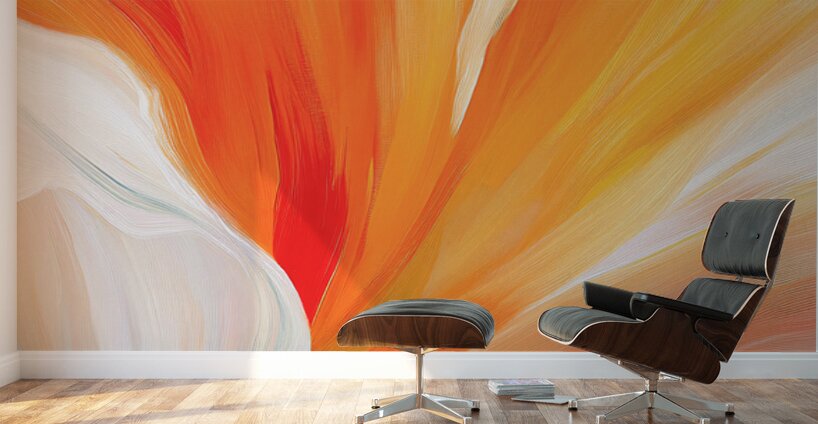 Vibrant orange and white hues flow together in a dynamic abstract floral design evoking a sense of movement and elegance. Bold sweeping lines create a...[+]
