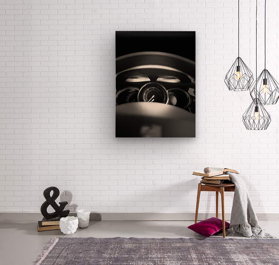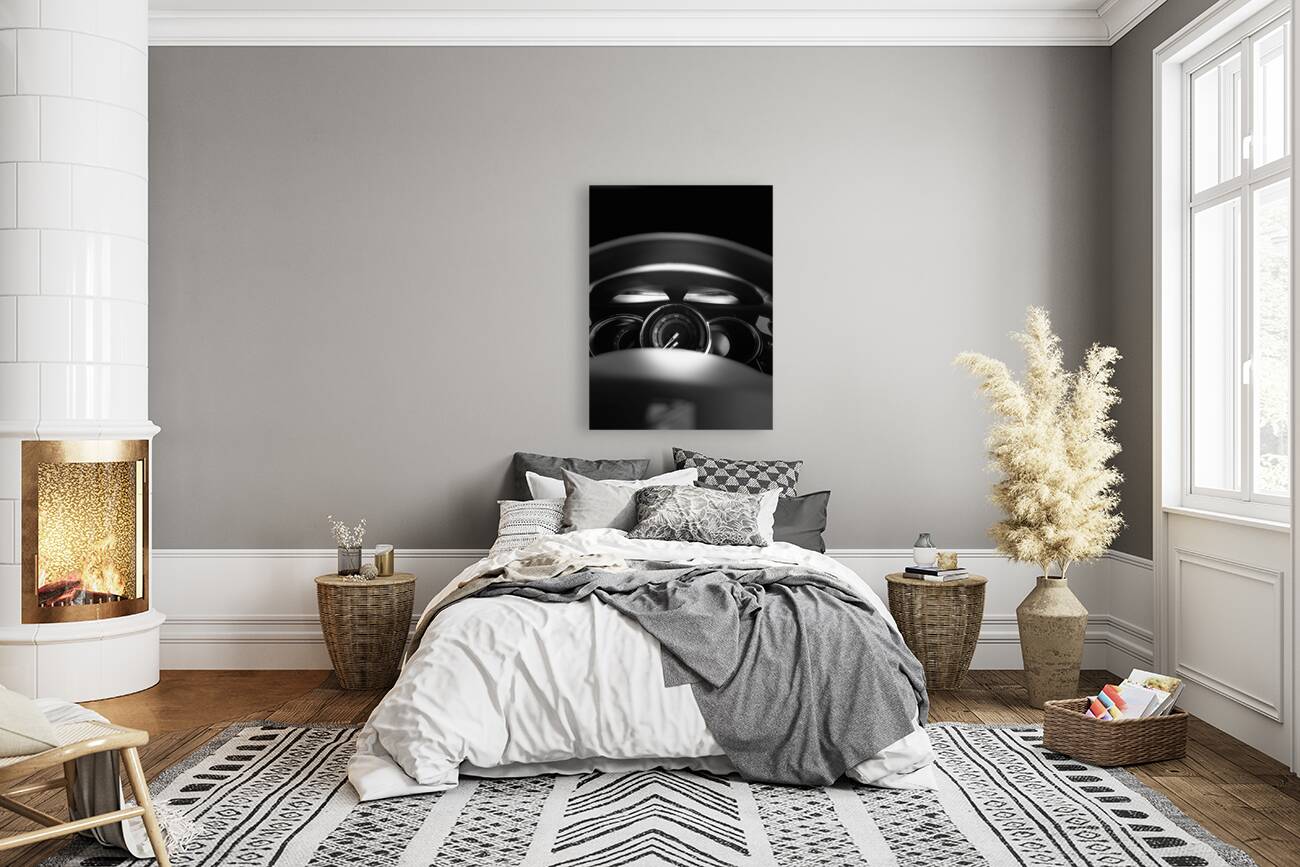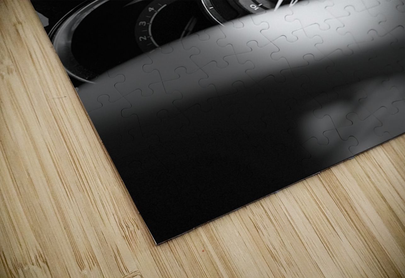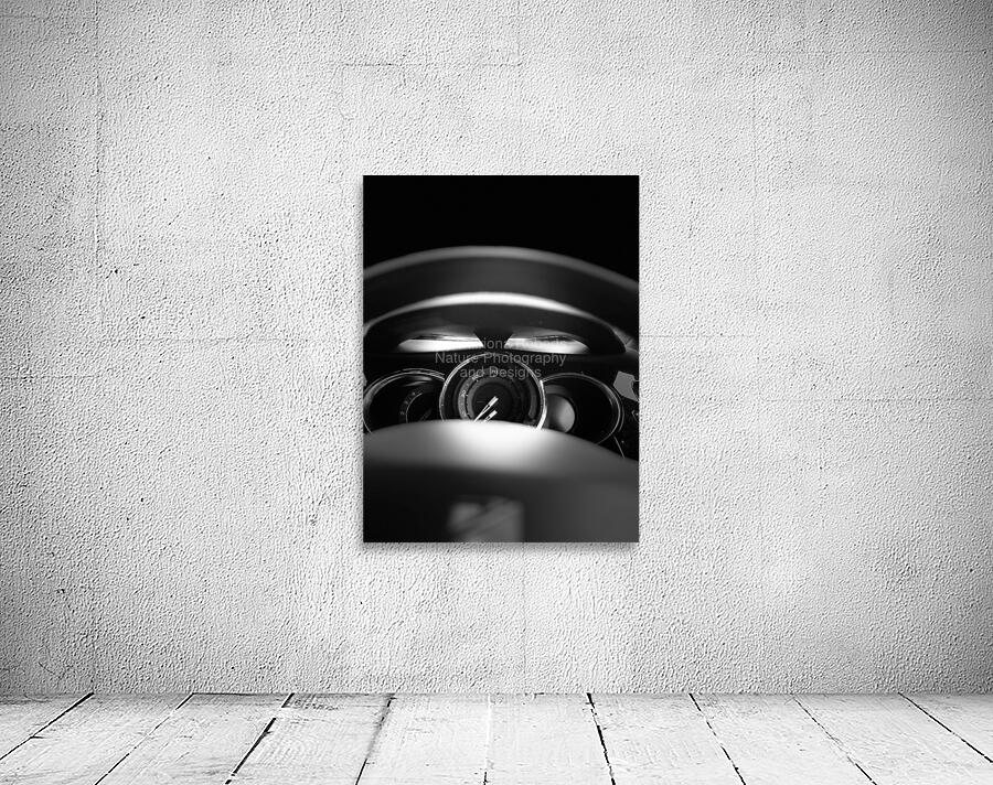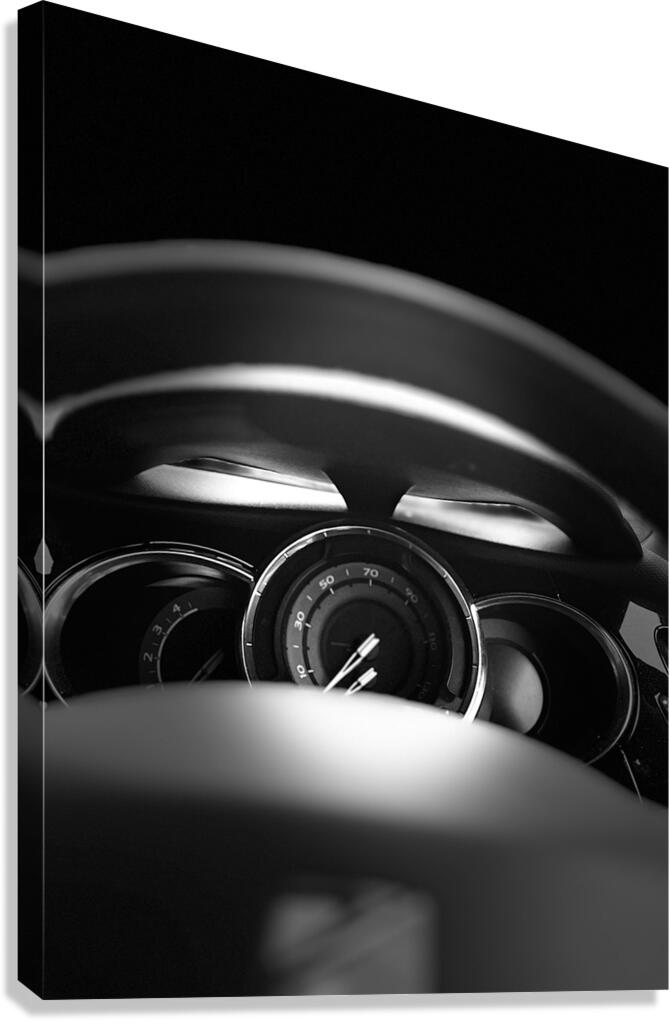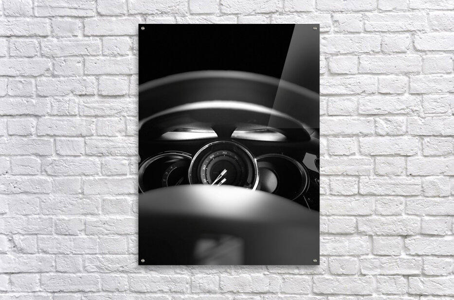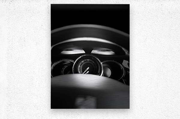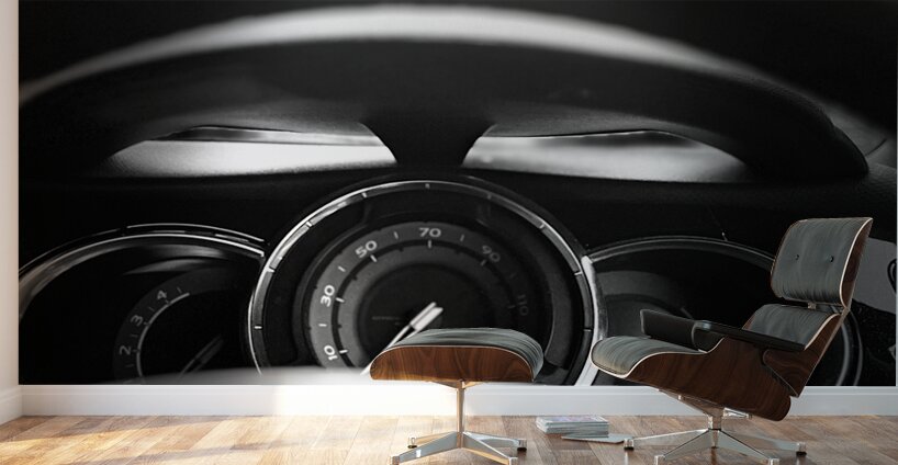 A black and white photo featuring a sleek ,elegant design of a car dashboard, focusing on the speedometer with subtle shadows. The minimal lighting enhances the modern, sophisticated feel of the interior.