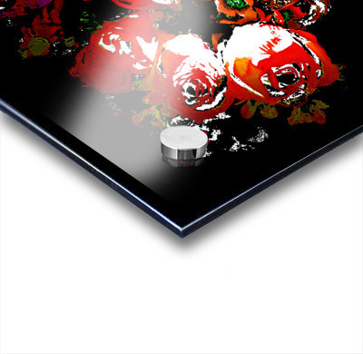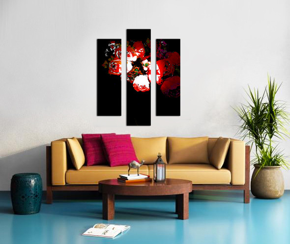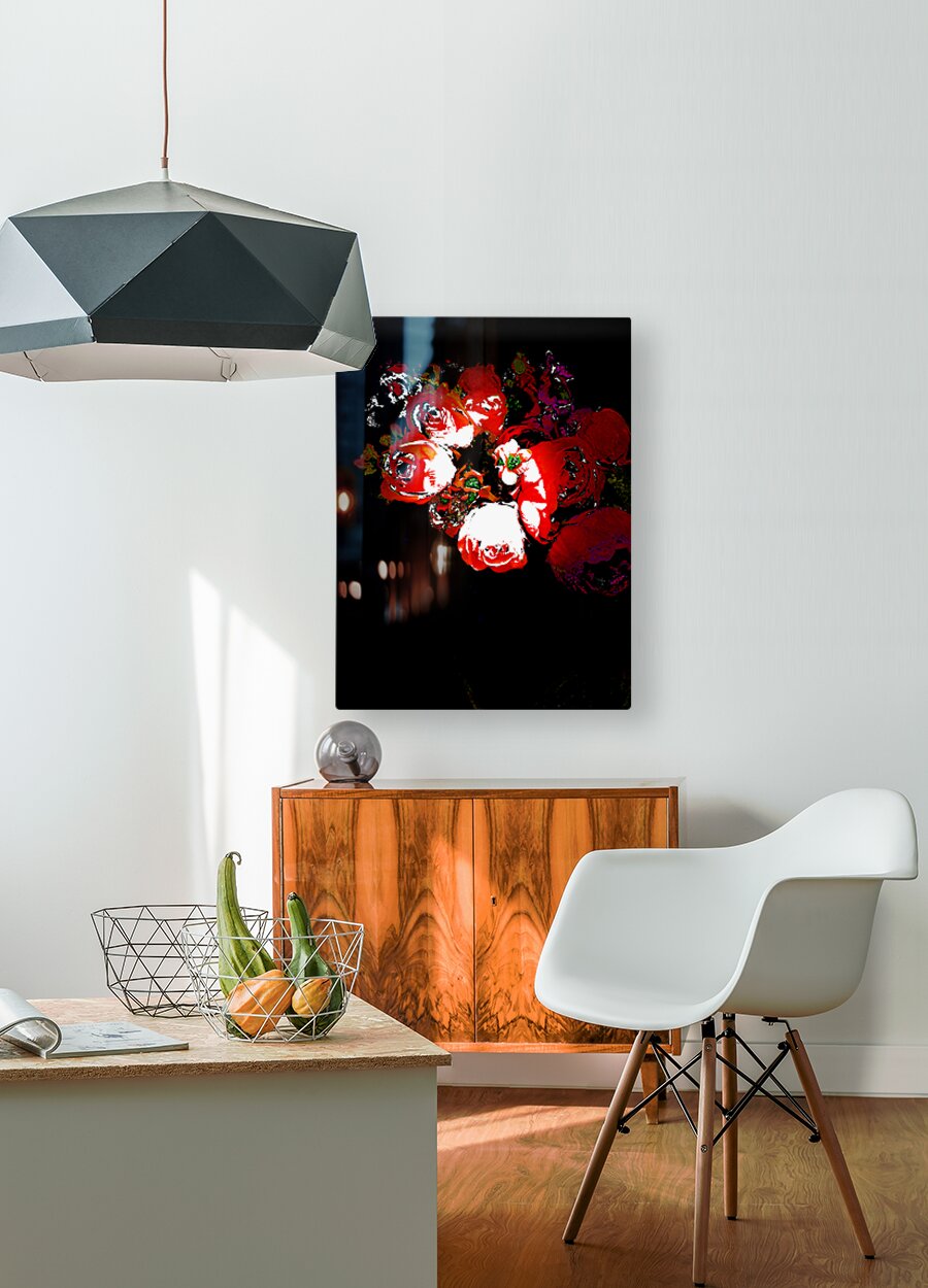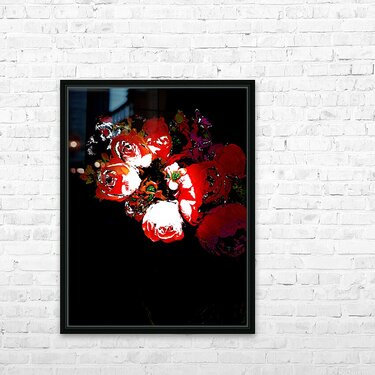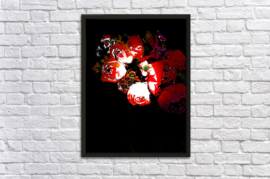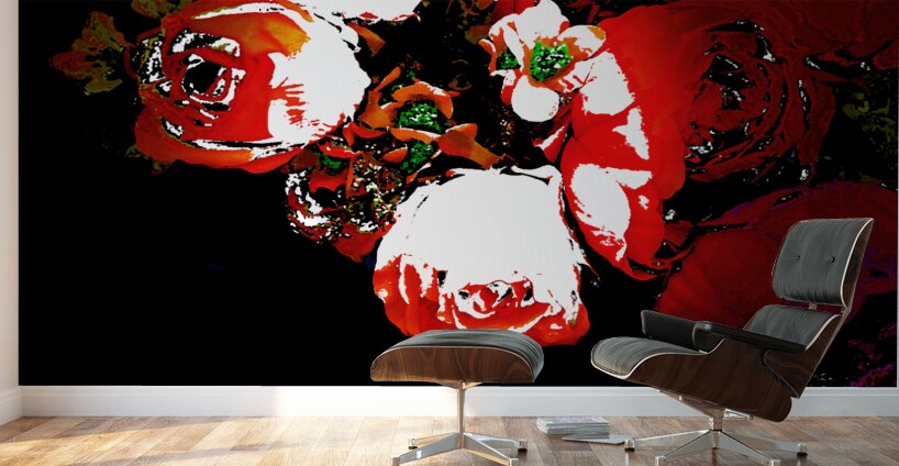 Originally a photo of a bouquet of fabric flowers laterally digitally manipulated to create a stunning piece of contemporary art. Features vibrant red and white flowers standing out against a dark background, creating a striking contrast. The details of the petals and leaves are enhanced with bright highlights.