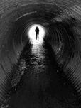 I took this photo at the beginning of a nature walk through the Scottish Highlands. Features a lone silhouette of a person walking through a dimly lit tunnel towards a bright light at the other end, creating a stark contrast between darkness and illumination. The curved walls of the tunnel are ribbed, adding depth and texture to the scene.