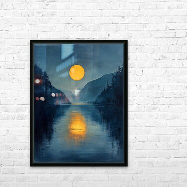A bright full moon casts a golden reflection on a serene lake surrounded by dark misty mountains. Tall trees frame the scene enhancing the tranquil at...[+]