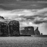Cliffs, headlands, and the sea stacks Risin og Kellingin on the north coast of Eysturoy, the second largest of the Faroe Islands in the North Atlantic...[+]