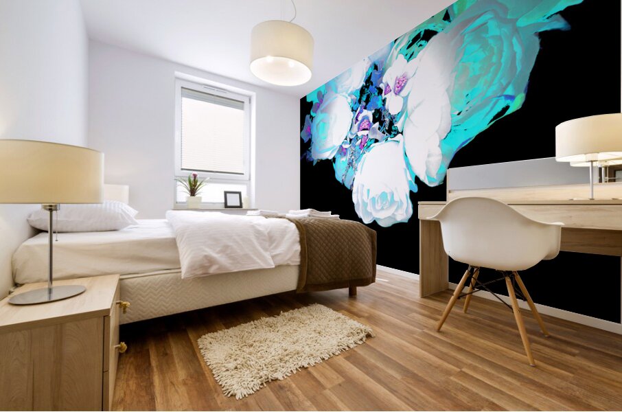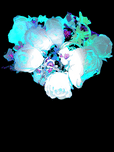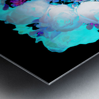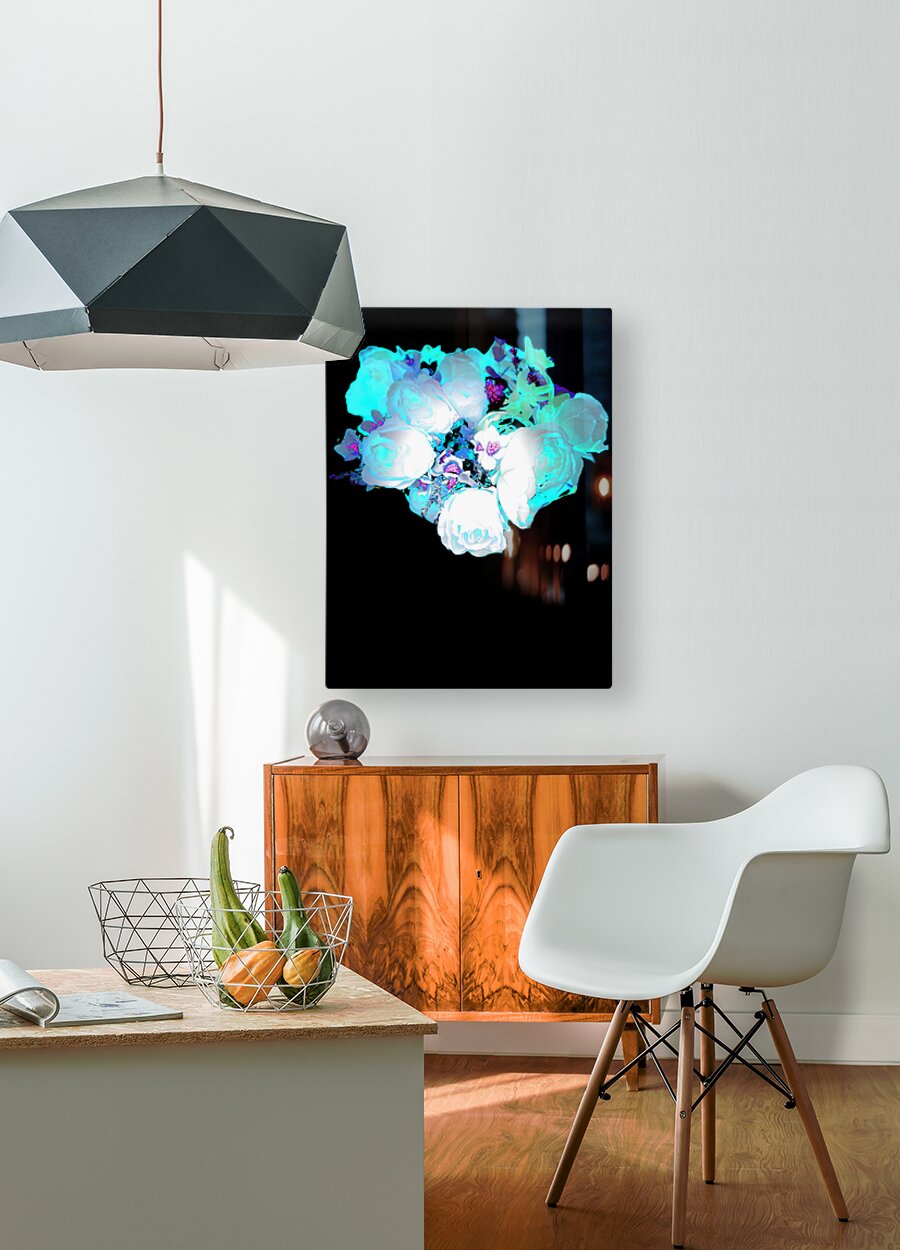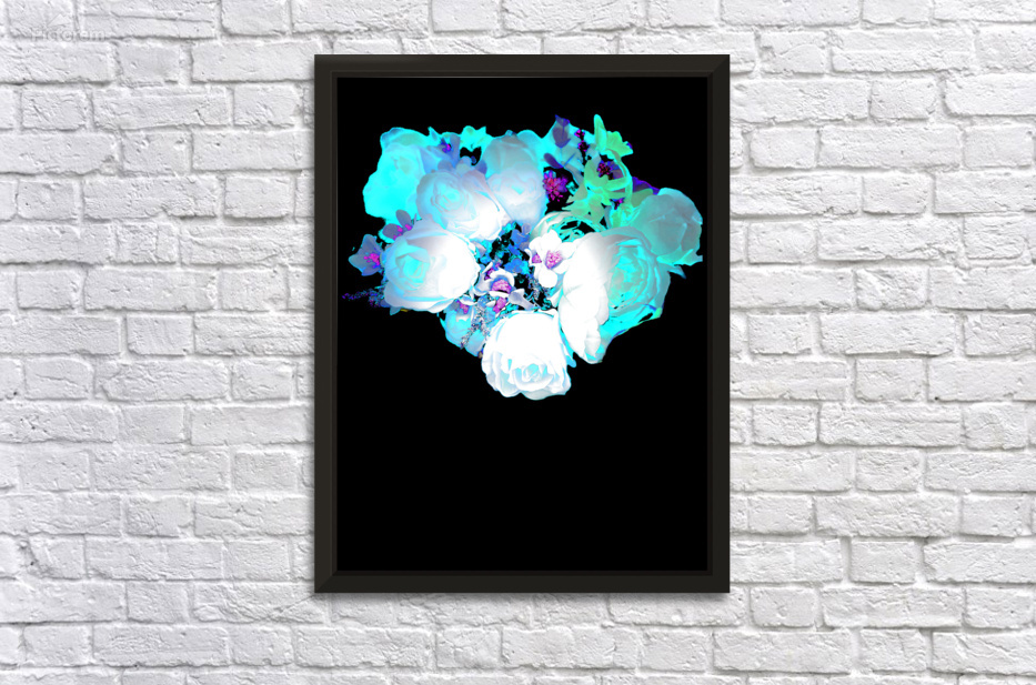 Originally a photo of fabric Roses laterally digitally manipulated ( using various means including the AI Magic Grab and Erase function within canva.com) into a stunning piece of contemporary floral art. Features gently glowing white roses in vibrant blue-green hues creating a striking contrast against the dark background. The floral composition is centered, capturing attention with its mix of delicate petals and bold colors.