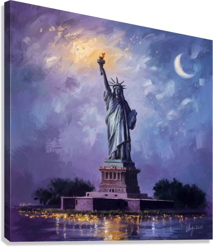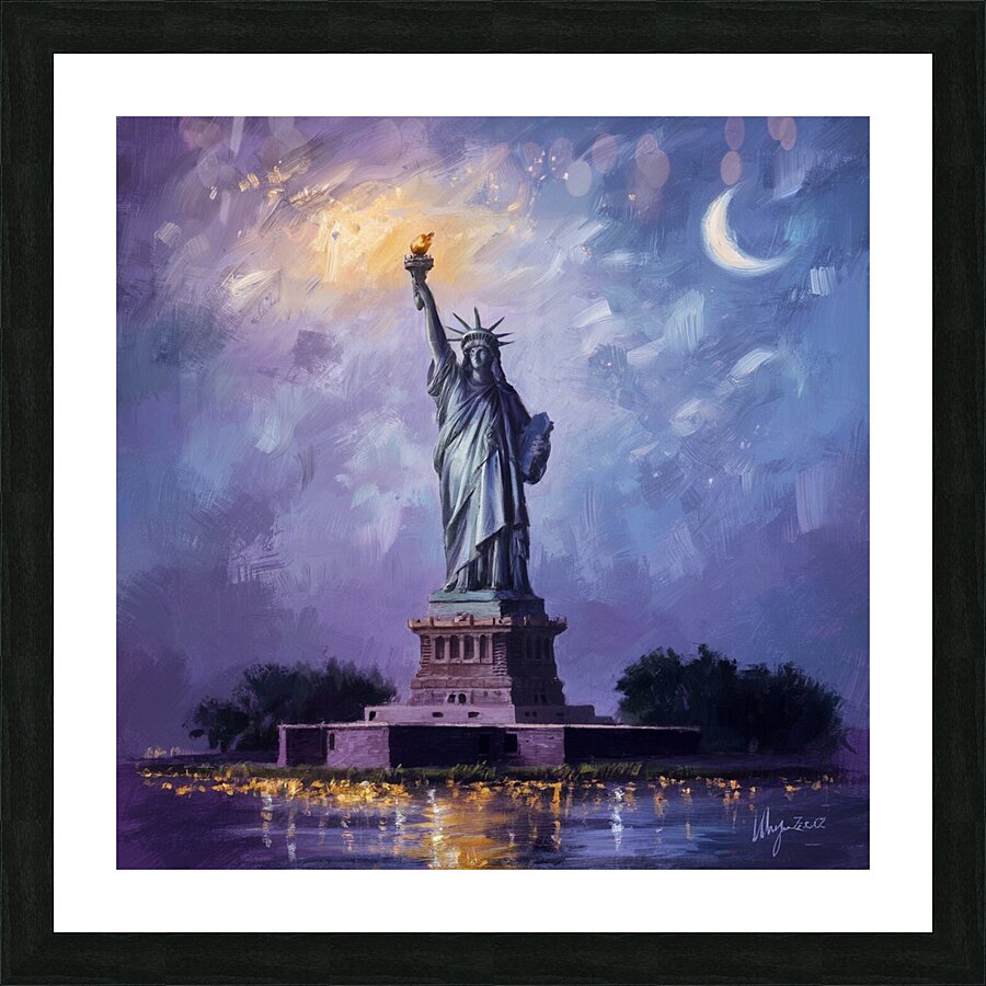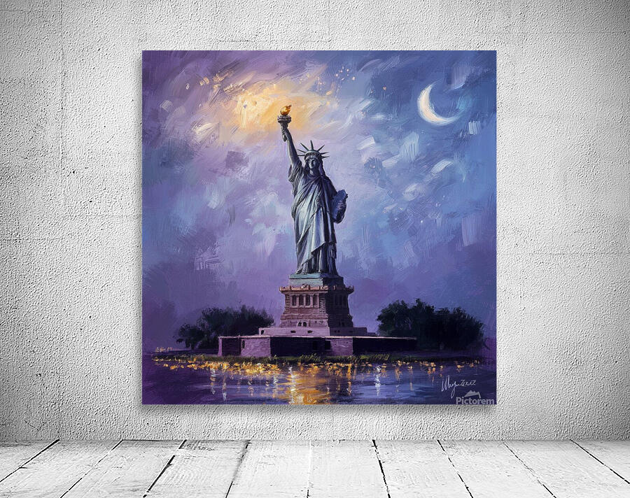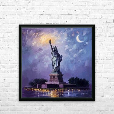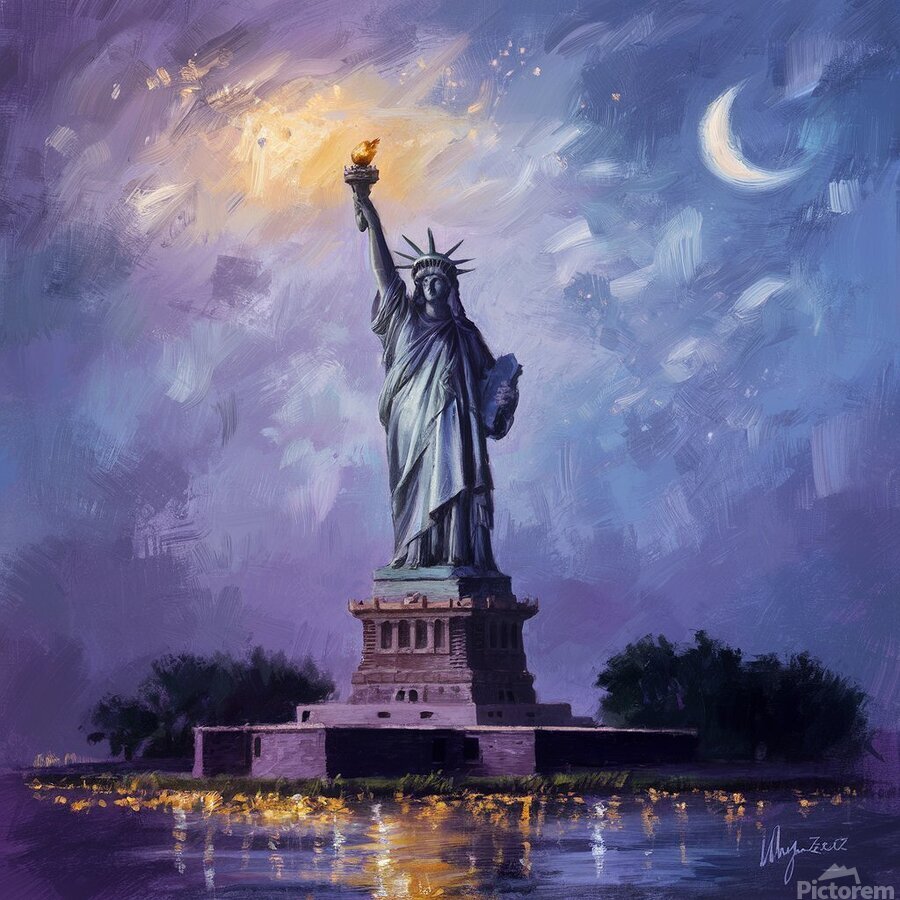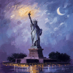 A captivating impressionist painting of the Statue of Liberty America under a starry night sky.