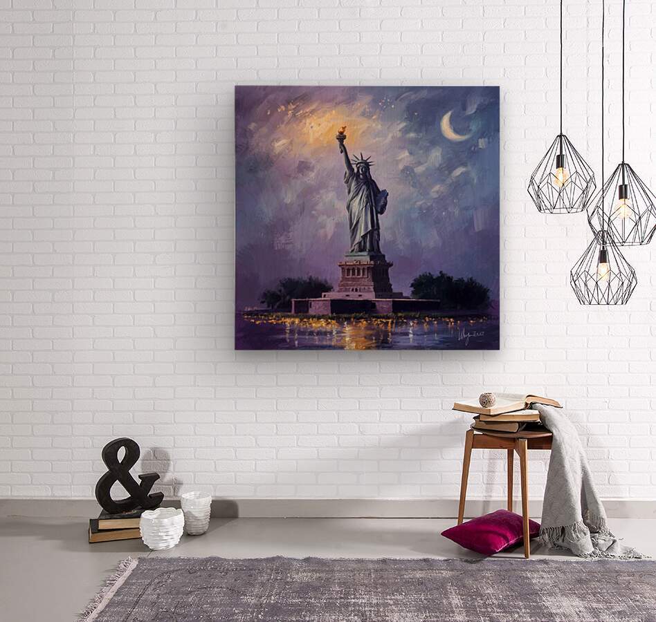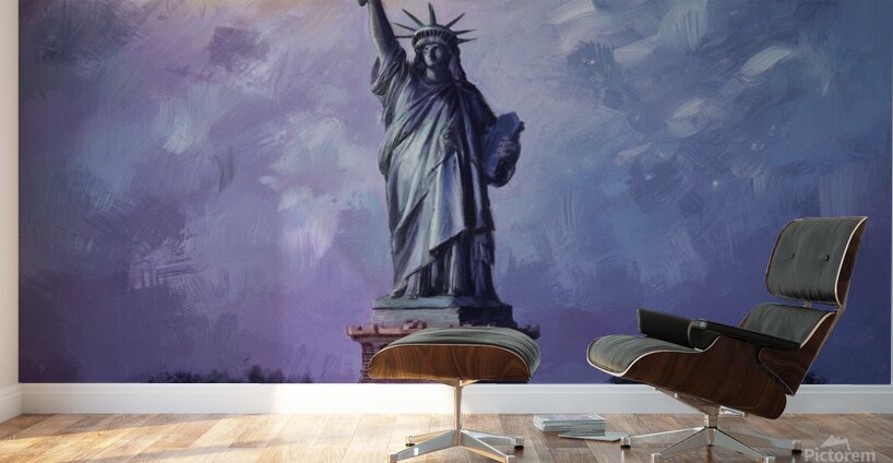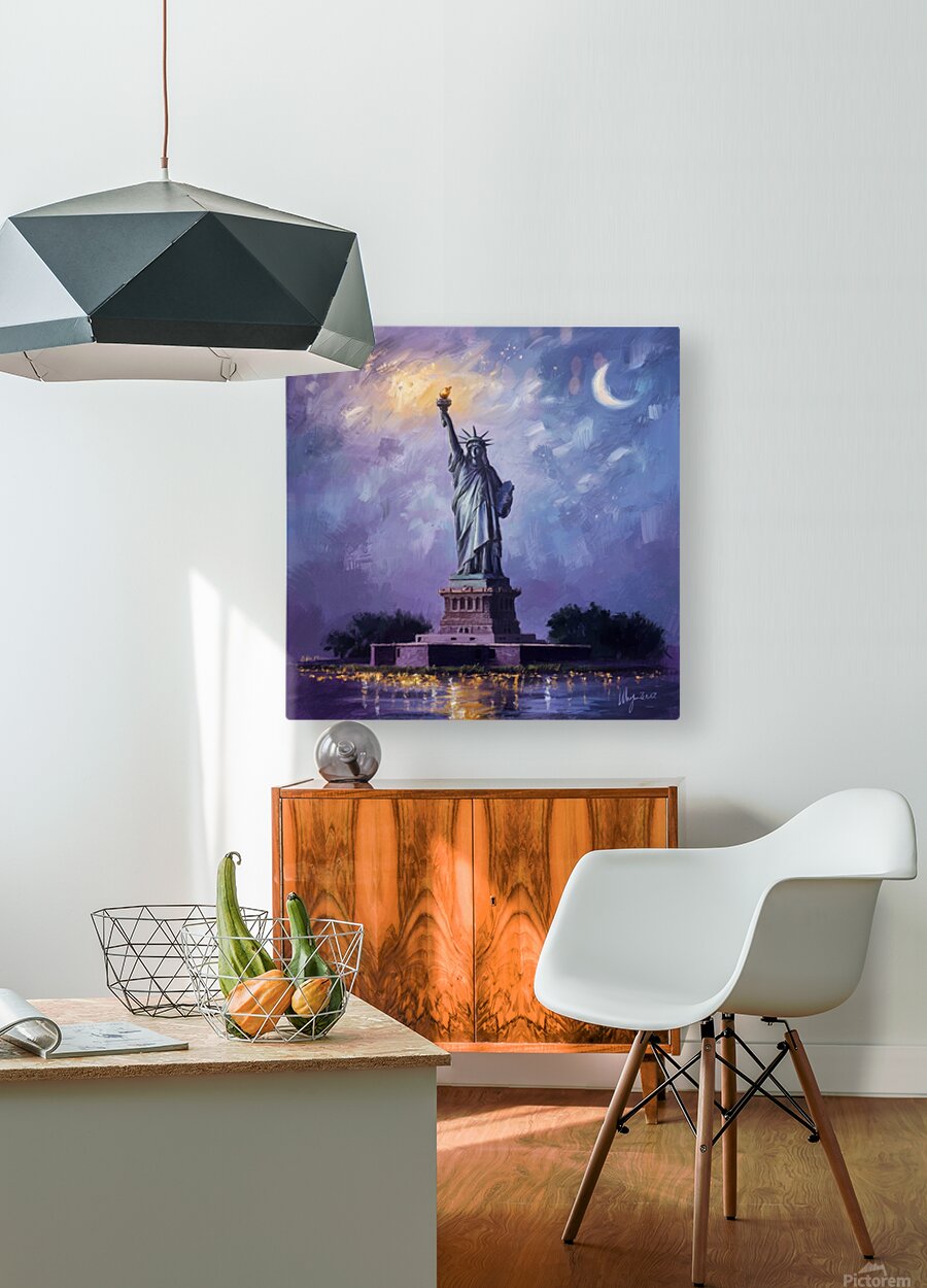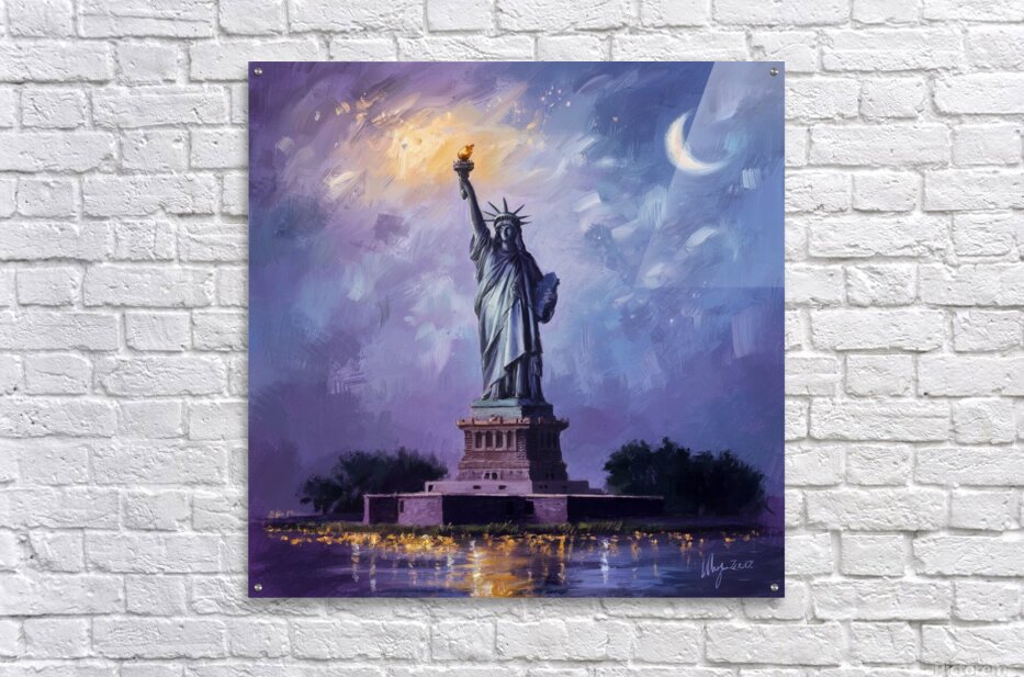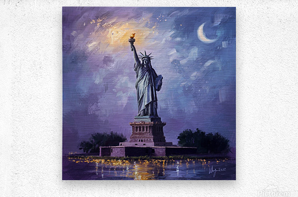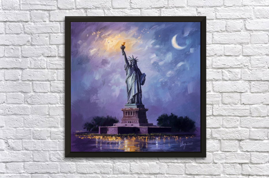 A captivating impressionist painting of the Statue of Liberty America under a starry night sky.
