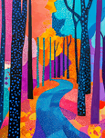 Vivid colors fill a whimsical forest with tall trees and a winding blue path. The vibrant hues of orange pink and blue create a dreamlike atmosphere.