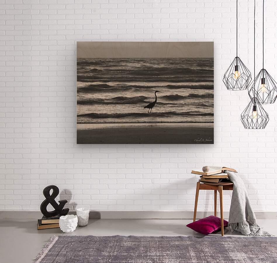 Great Blue Heron Wading for Breakfast ~ black and white North Padre Island  Wood print