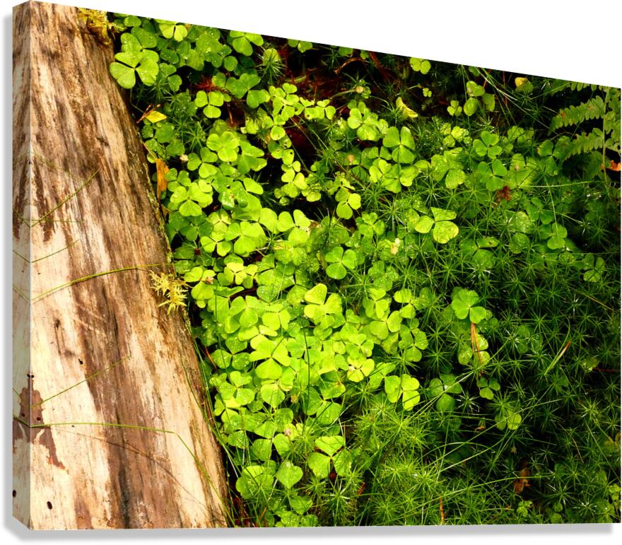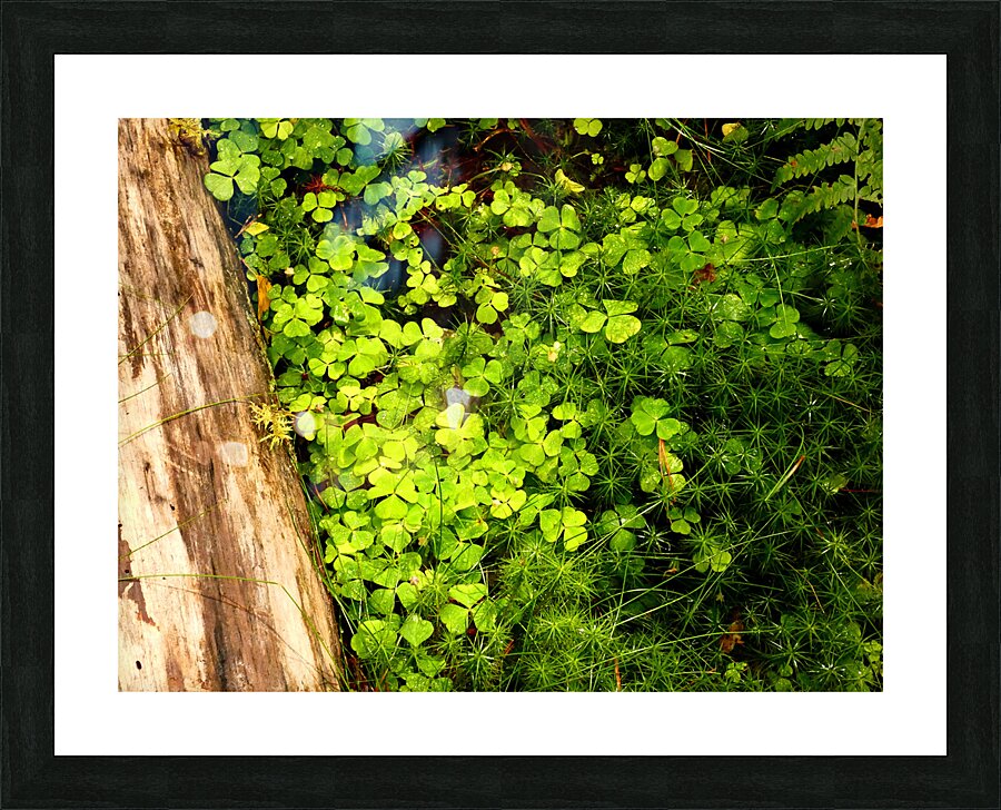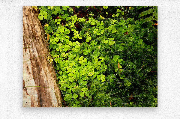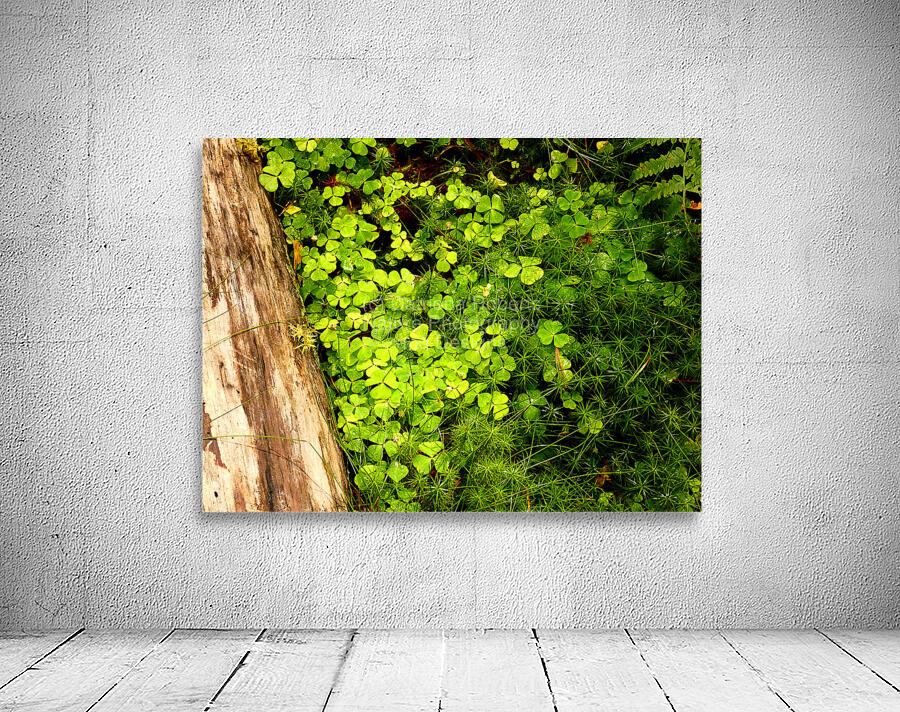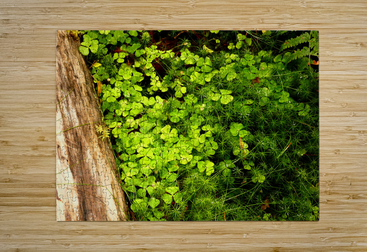I took this photo during a lovely nature walk through the Scottish Highlands. Features a collection of bright green clovers and star-shaped moss spreading across the forest floor next to a weathered log. Sunlight filters through, highlighting the natural textures and vibrant greenery.