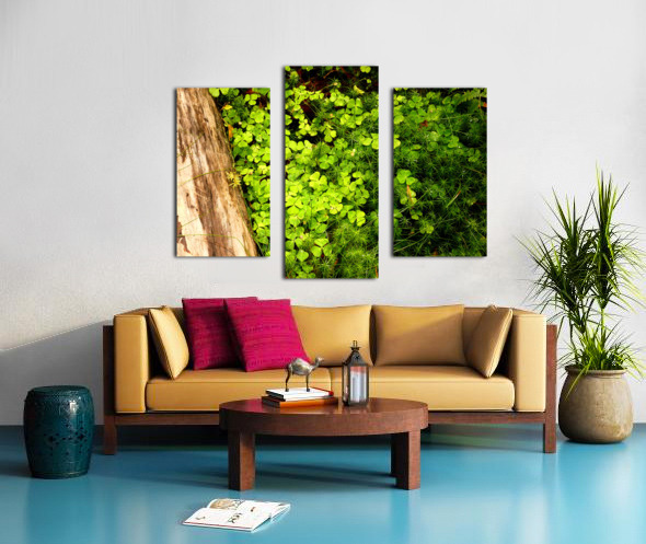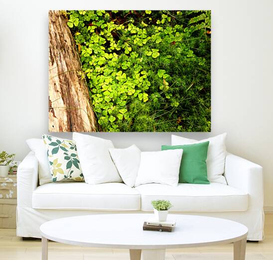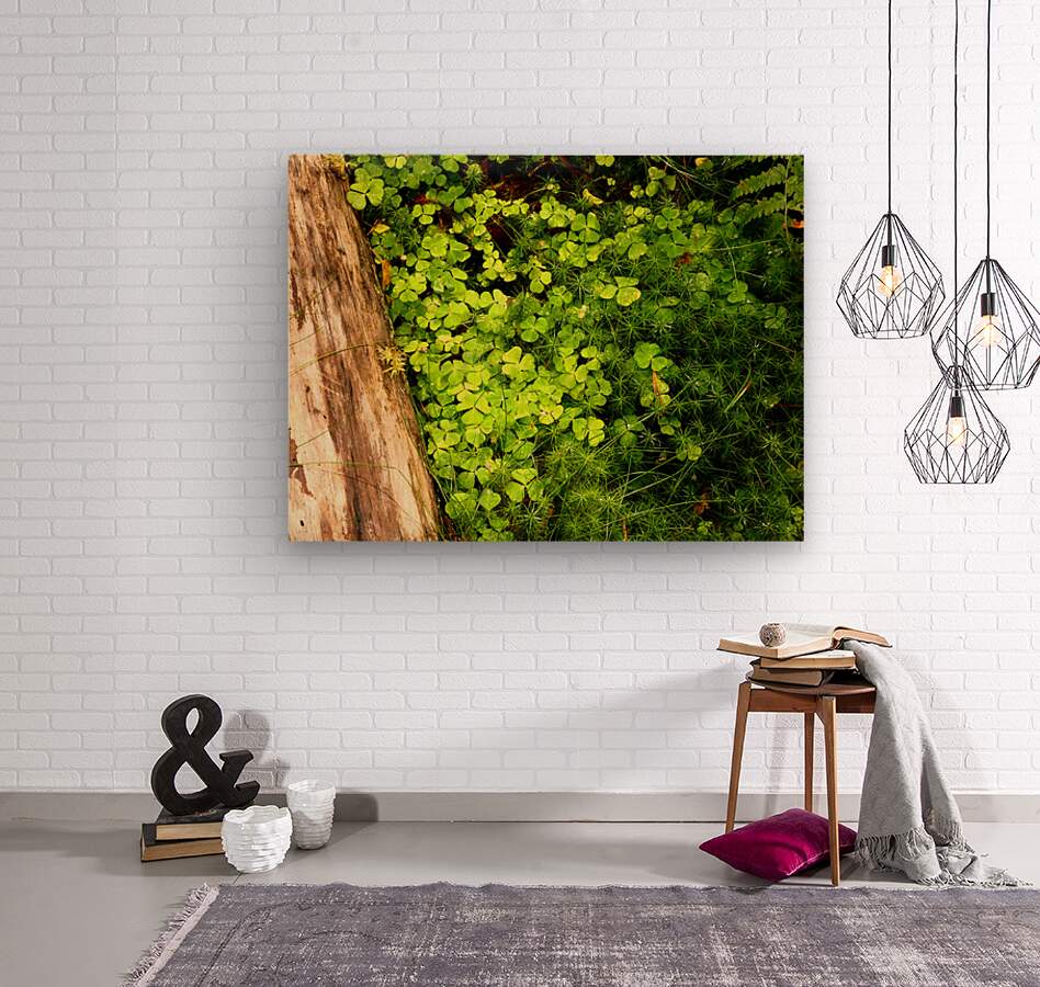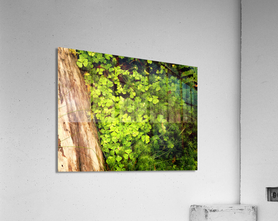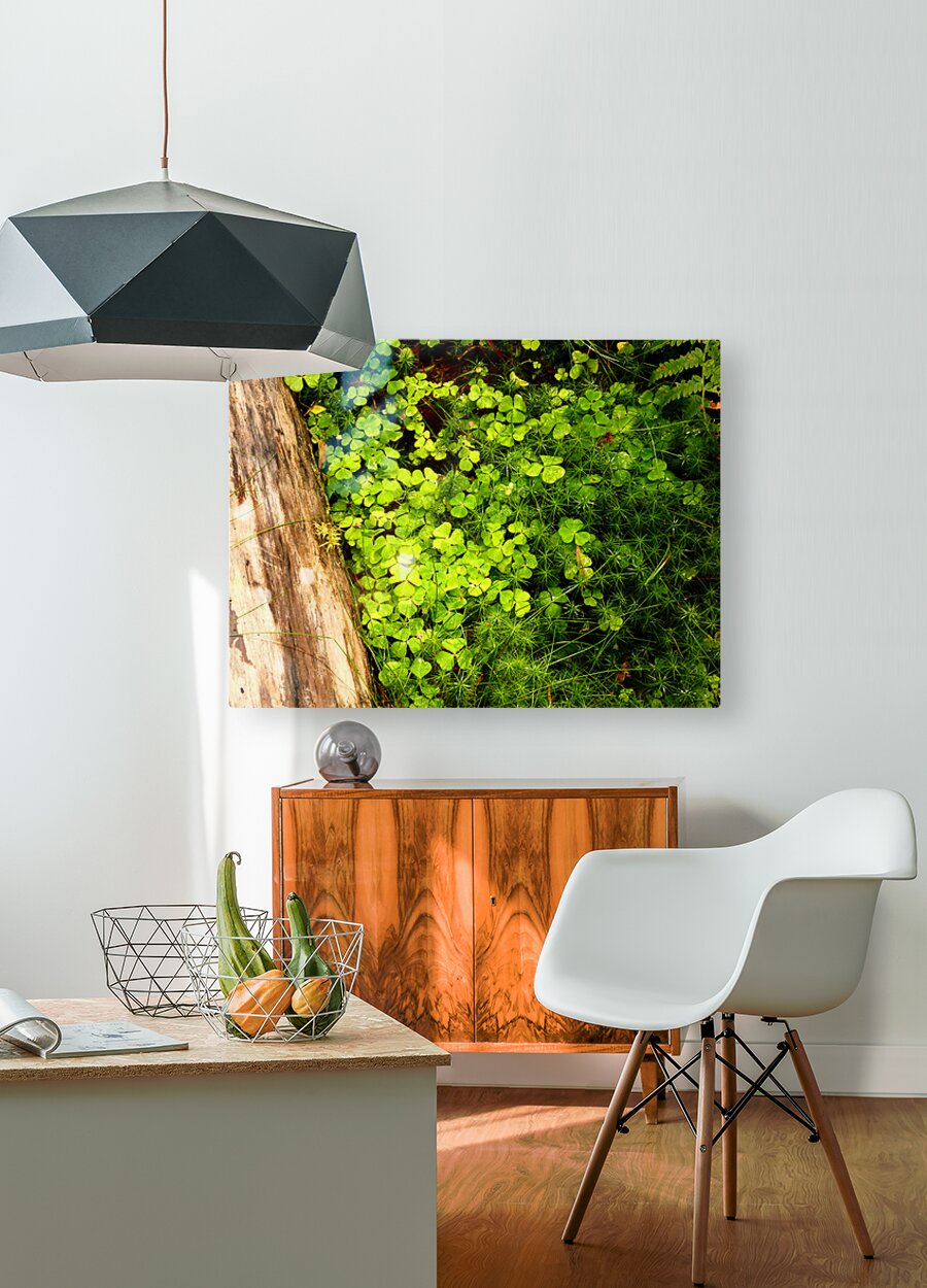 I took this photo during a lovely nature walk through the Scottish Highlands. Features a collection of bright green clovers and star-shaped moss spreading across the forest floor next to a weathered log. Sunlight filters through, highlighting the natural textures and vibrant greenery.