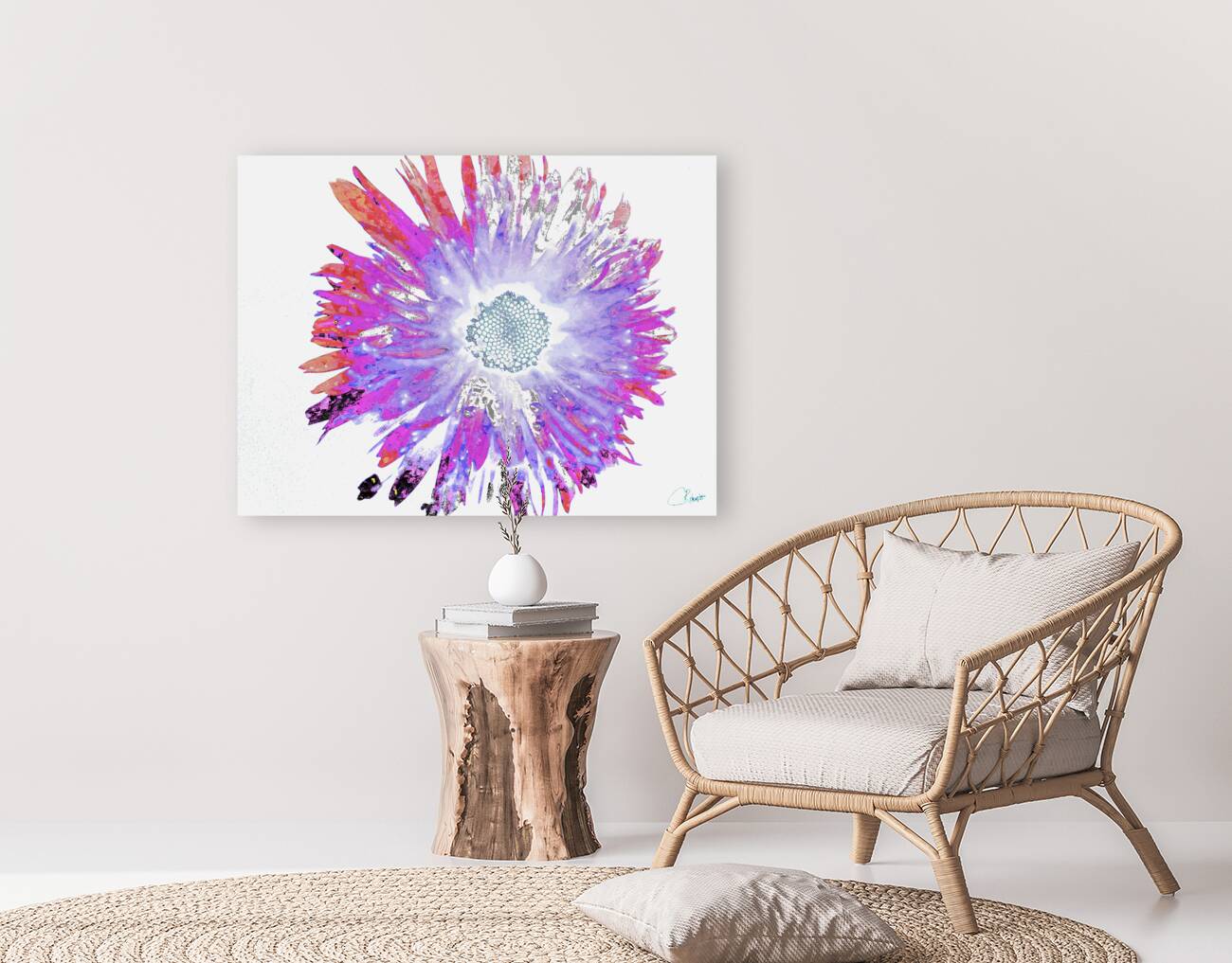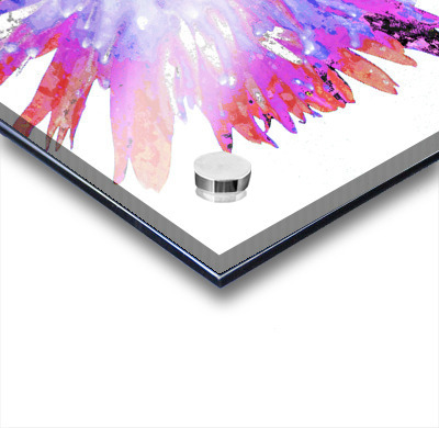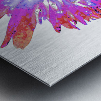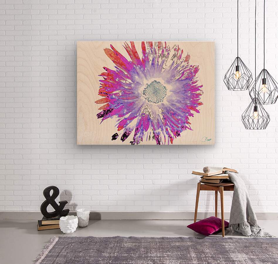Originally a close up photo of a Daisy flower and a hand painted acrylic laterally digitally manipulated and combined to create a stunning piece of contemporary floral art. Features a vibrant Daisy bursting with shades of pink, purple, and blue, creating a mesmerizing kaleidoscope effect. The petals radiate outward from the intricate center, giving the impression of dynamic movement.