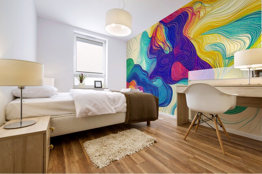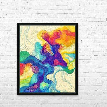 Vibrant flowing lines in a spectrum of colors create an intricate pattern reminiscent of swirling currents. The harmonious blend of reds blues greens ...[+]