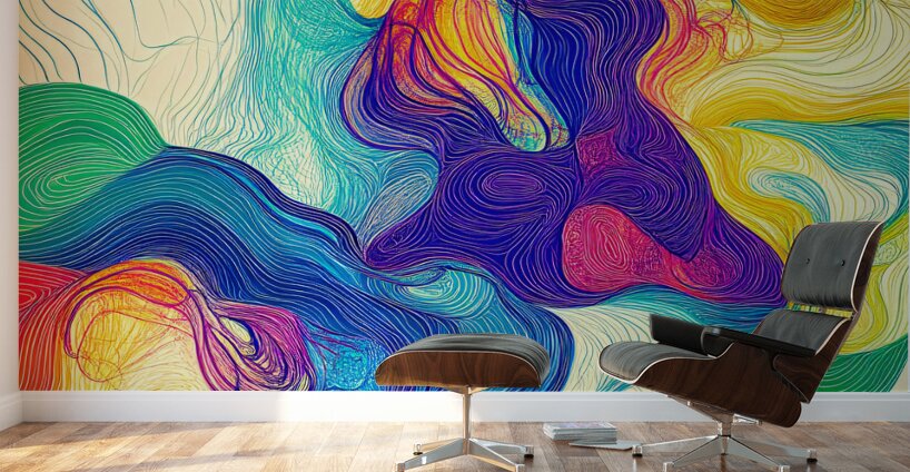 Vibrant flowing lines in a spectrum of colors create an intricate pattern reminiscent of swirling currents. The harmonious blend of reds blues greens and yellows lends a sense of dynamic movement and energy.