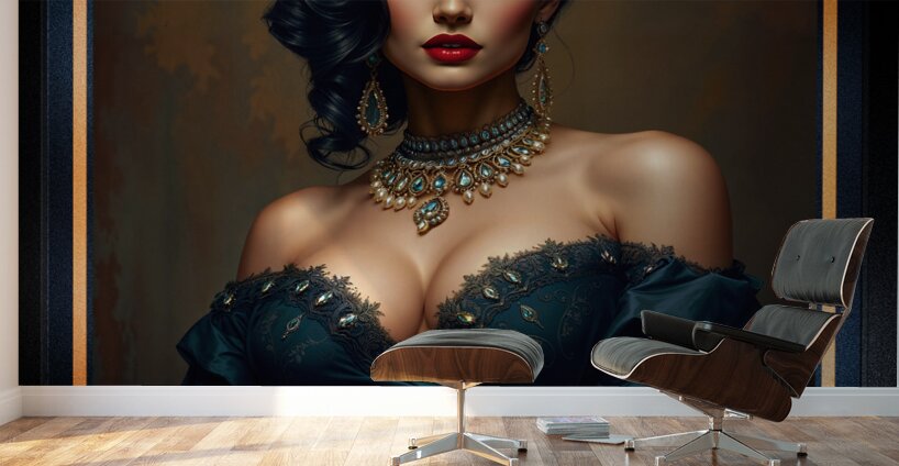 A woman with dark hair and striking makeup wears an elegant, bejeweled necklace and a richly detailed gown. Her confident gaze and elaborate jewelry c...[+]