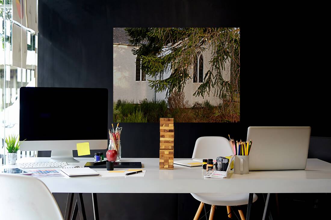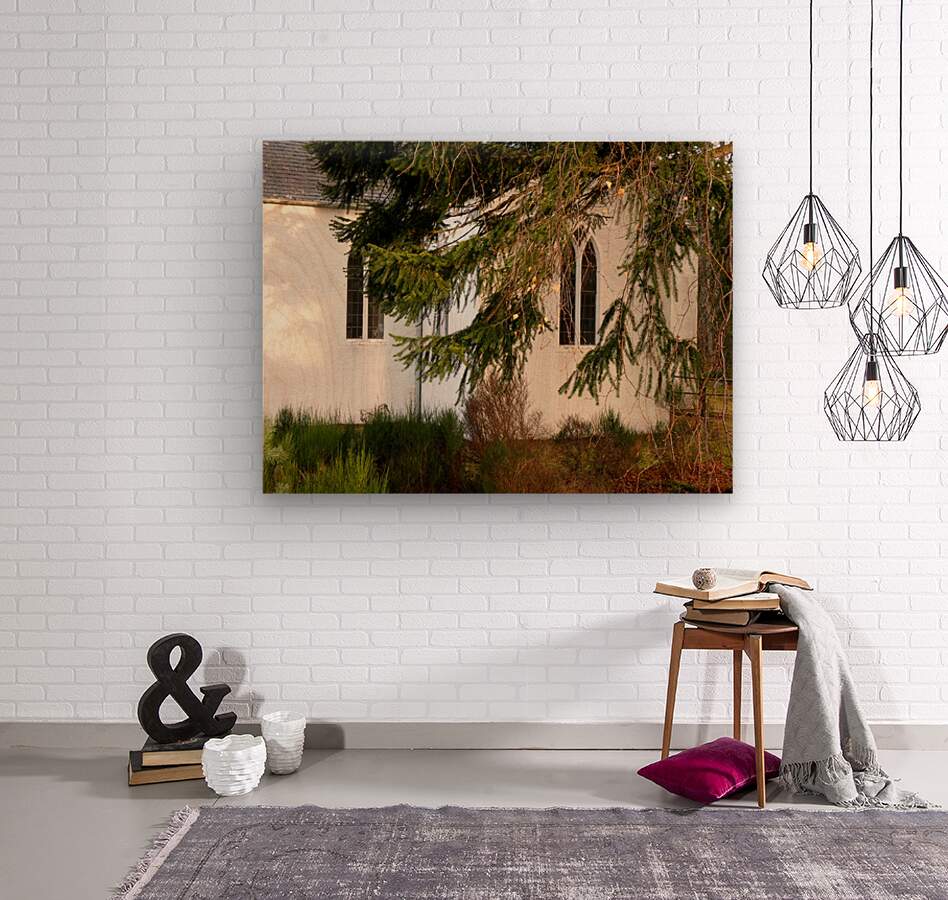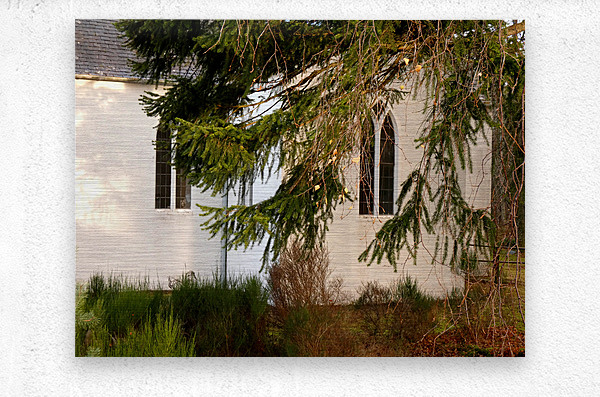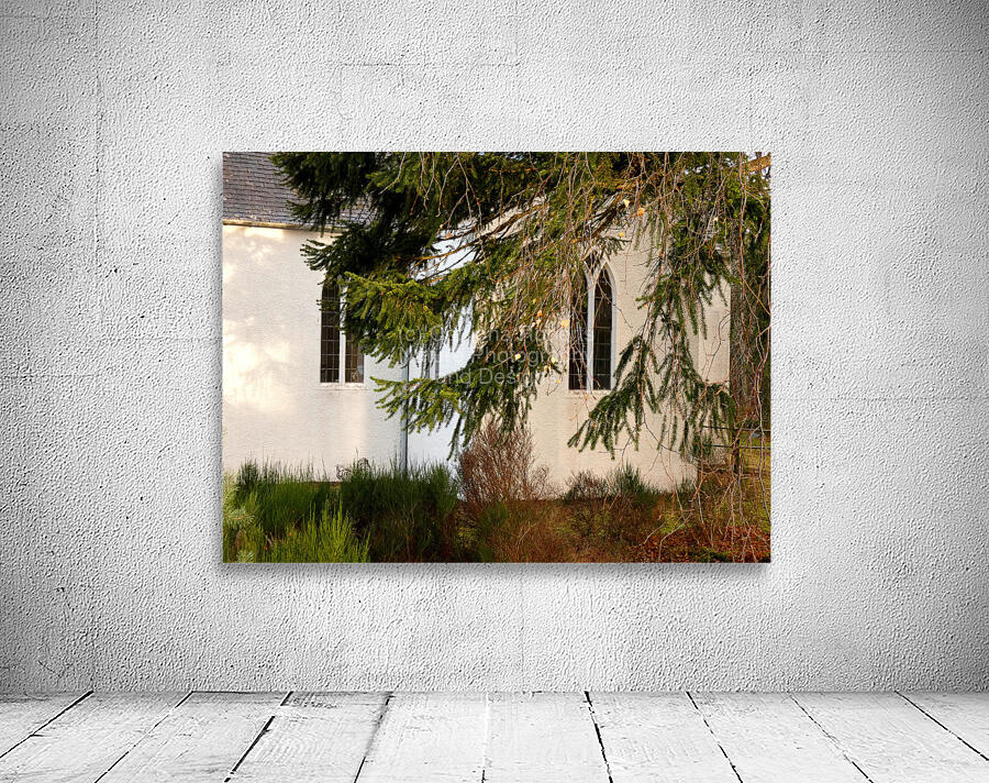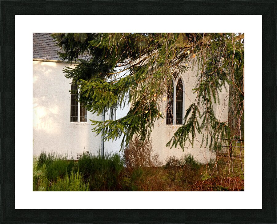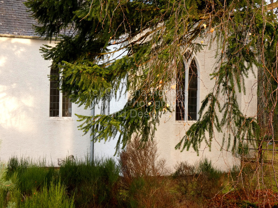 A coloured photo features a lovely white church nestled in the heart of the Scottish Highlands, as sunlight filters through evergreen branches, castin...[+]