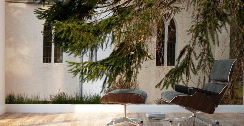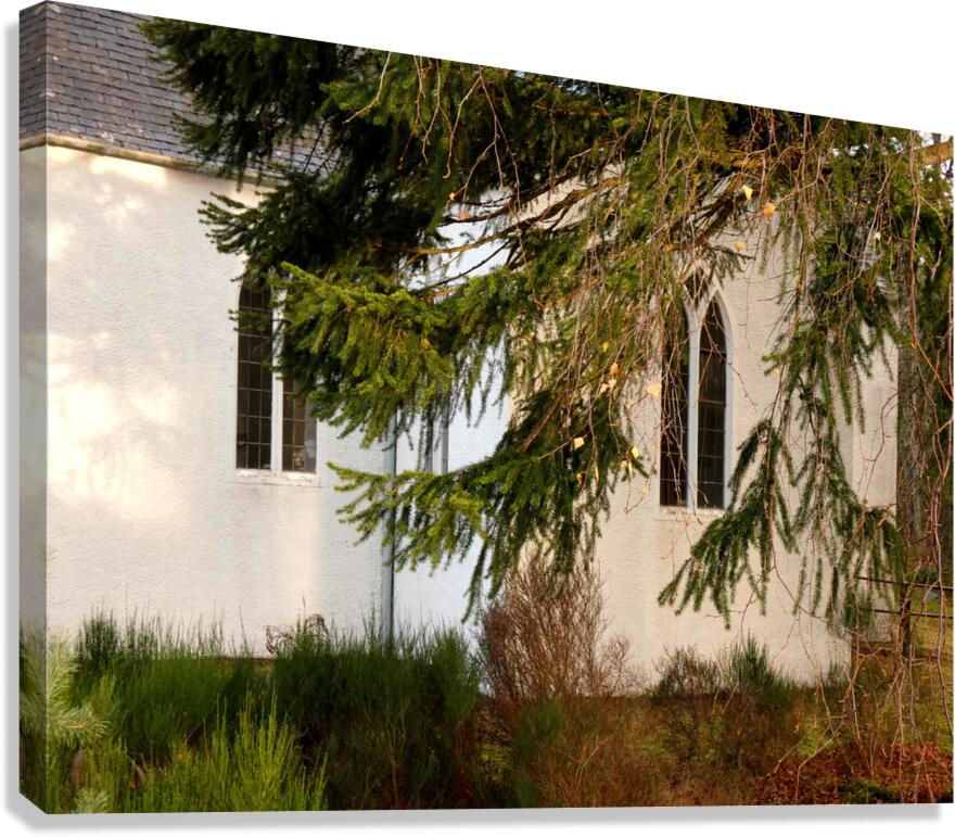 A coloured photo features a lovely white church nestled in the heart of the Scottish Highlands, as sunlight filters through evergreen branches, casting shadows on the white walls and showcasing the arched windows. The surrounding greenery adds a peaceful and natural atmosphere.