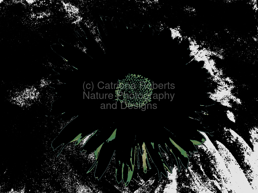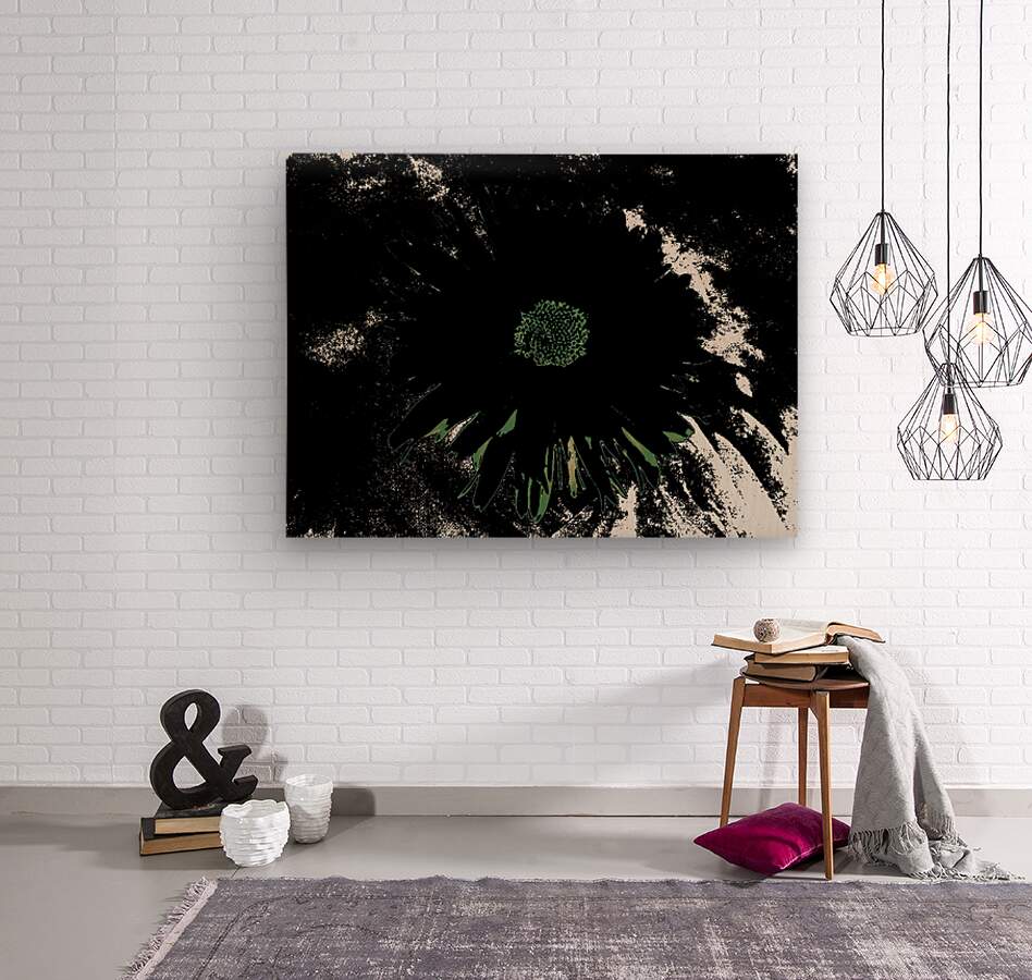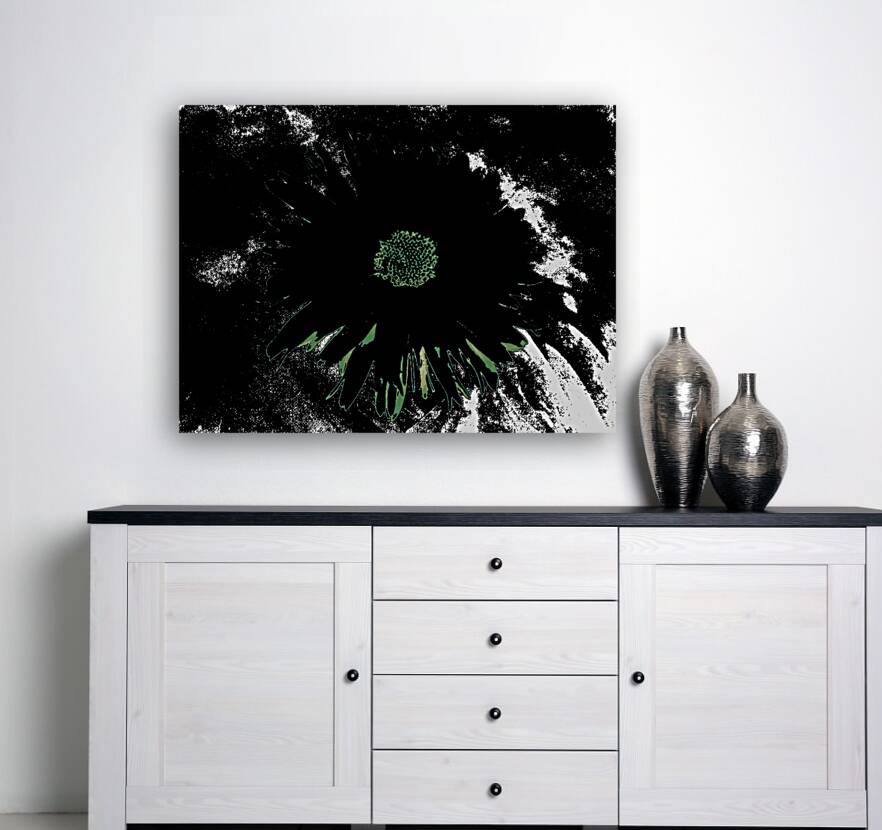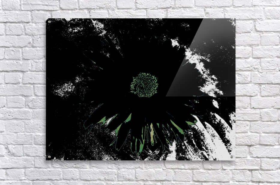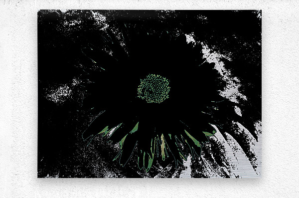 Originally a close up photo of a Daisy flower and a hand painted acrylic, laterally digitally manipulated and combined to create a stunning piece of contemporary floral art. Features a bold, dark Daisy standing out against a contrasting background with an abstract, high contrast effect. The vibrant center of the flower is highlighted amidst the shadowy petals.