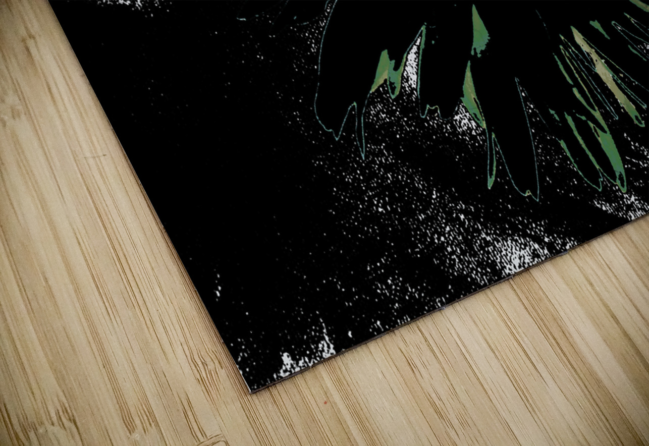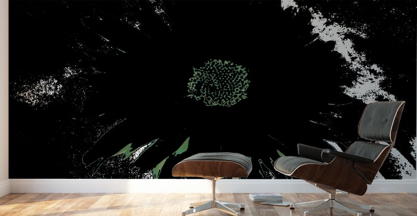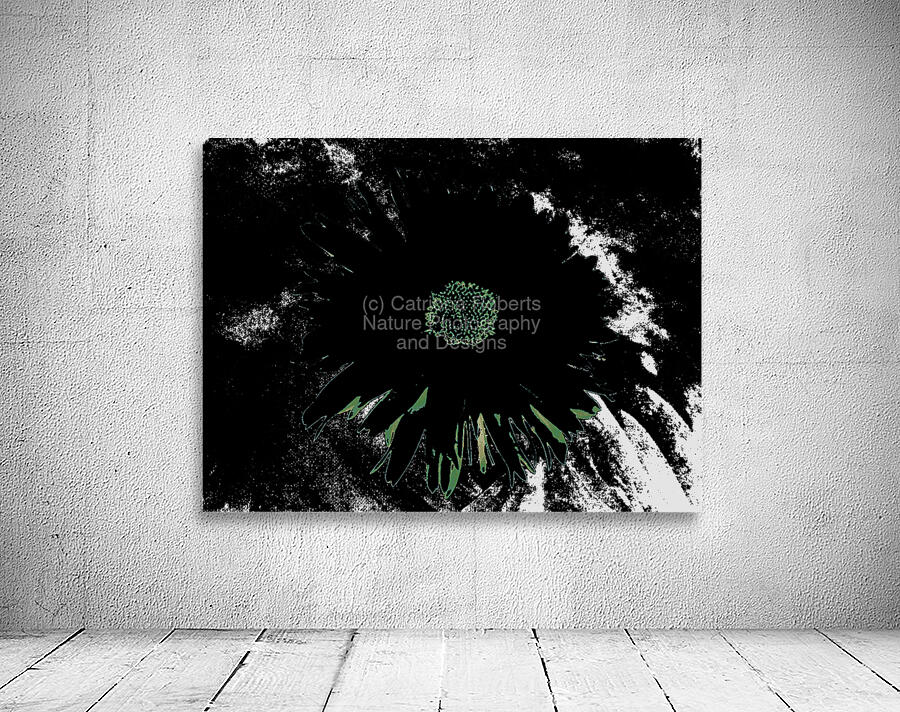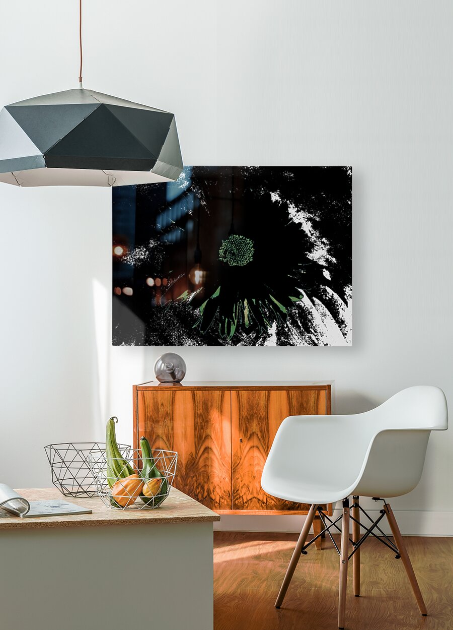 Originally a close up photo of a Daisy flower and a hand painted acrylic, laterally digitally manipulated and combined to create a stunning piece of contemporary floral art. Features a bold, dark Daisy standing out against a contrasting background with an abstract, high contrast effect. The vibrant center of the flower is highlighted amidst the shadowy petals.