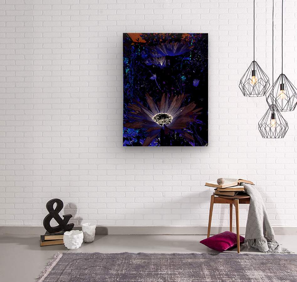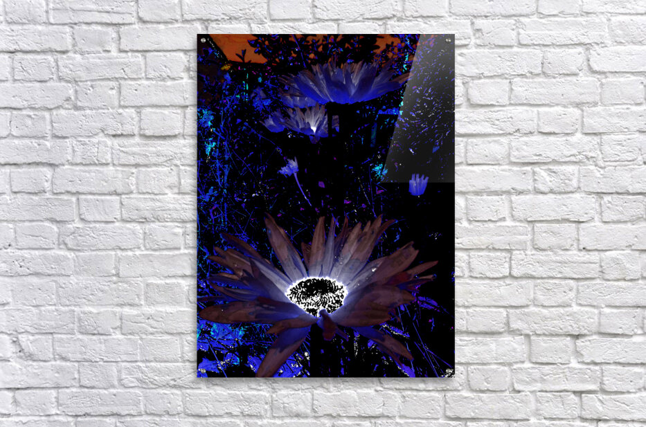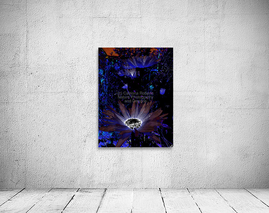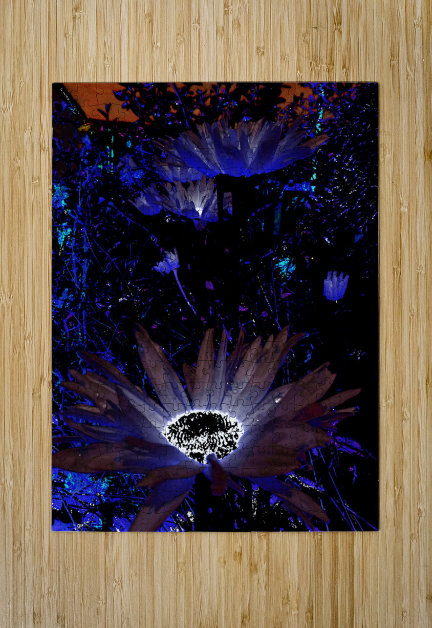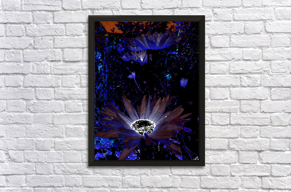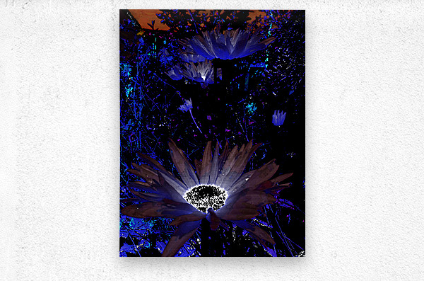 Originally a photo of Daisy flowers laterally digitally manipulated into a stunning piece of contemporary floral art. Features a surreal and vivid color palette, showcasing large Daises with blue and purple hues emerging in a mysterious and dreamlike garden. The illuminated petals contrast starkly against the dark background, creating an ethereal, otherworldly atmosphere.