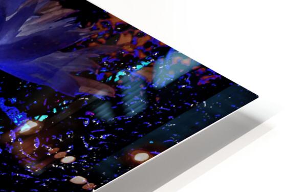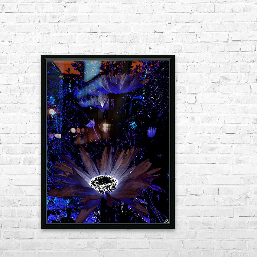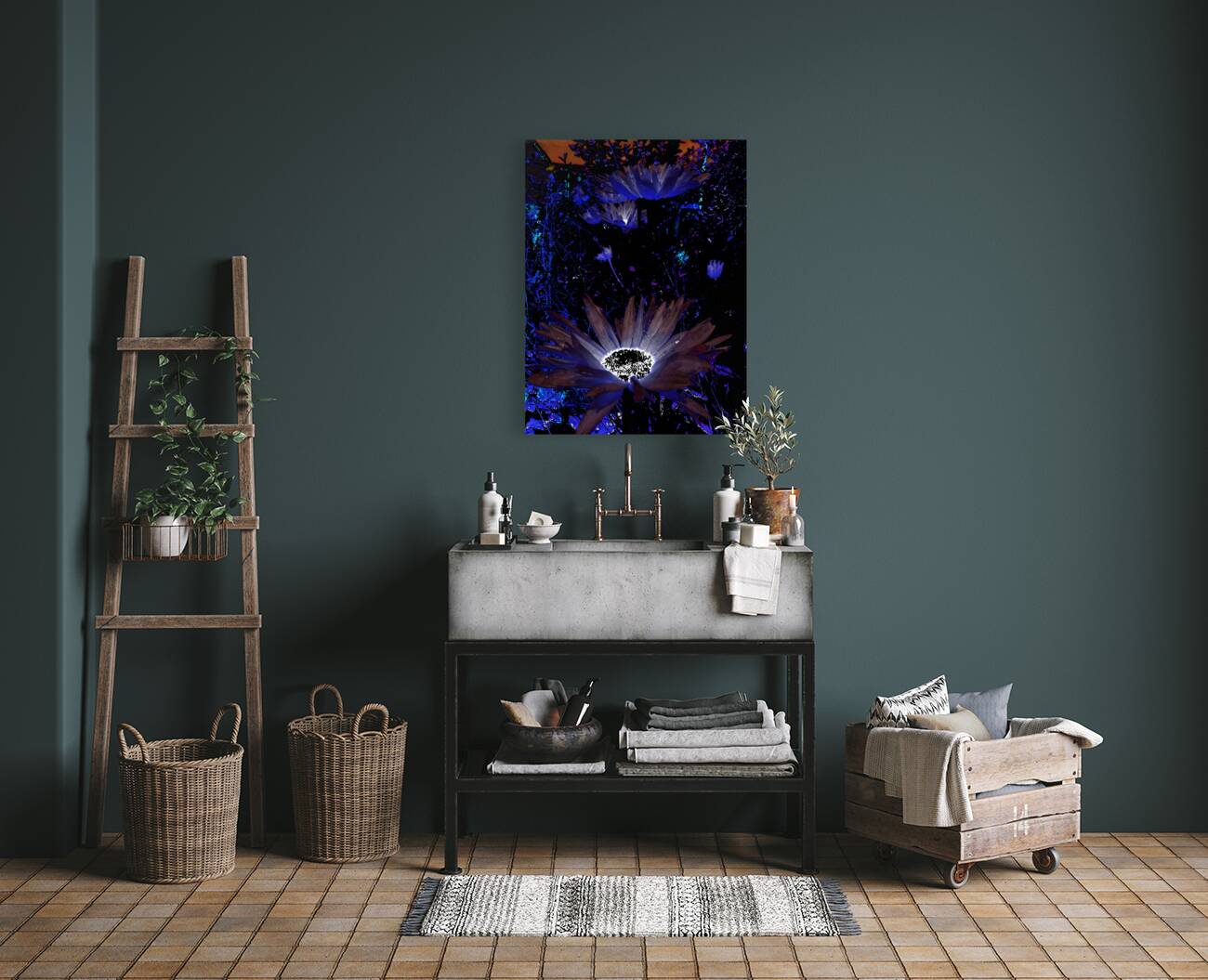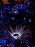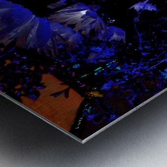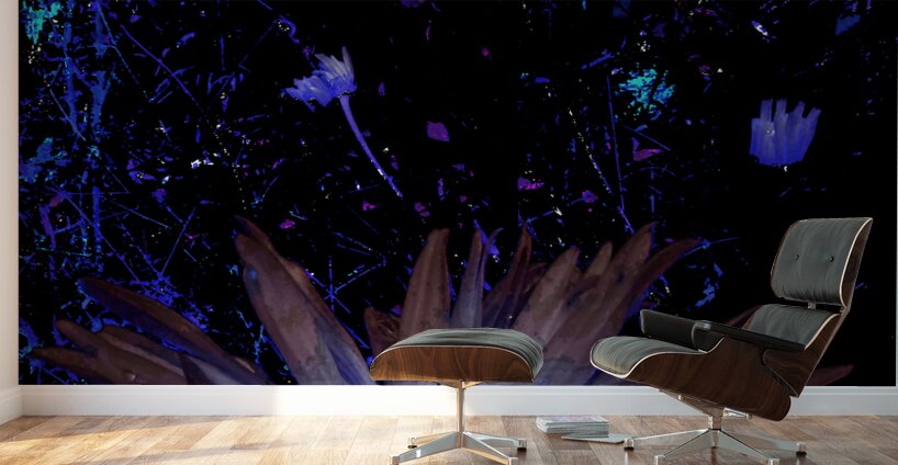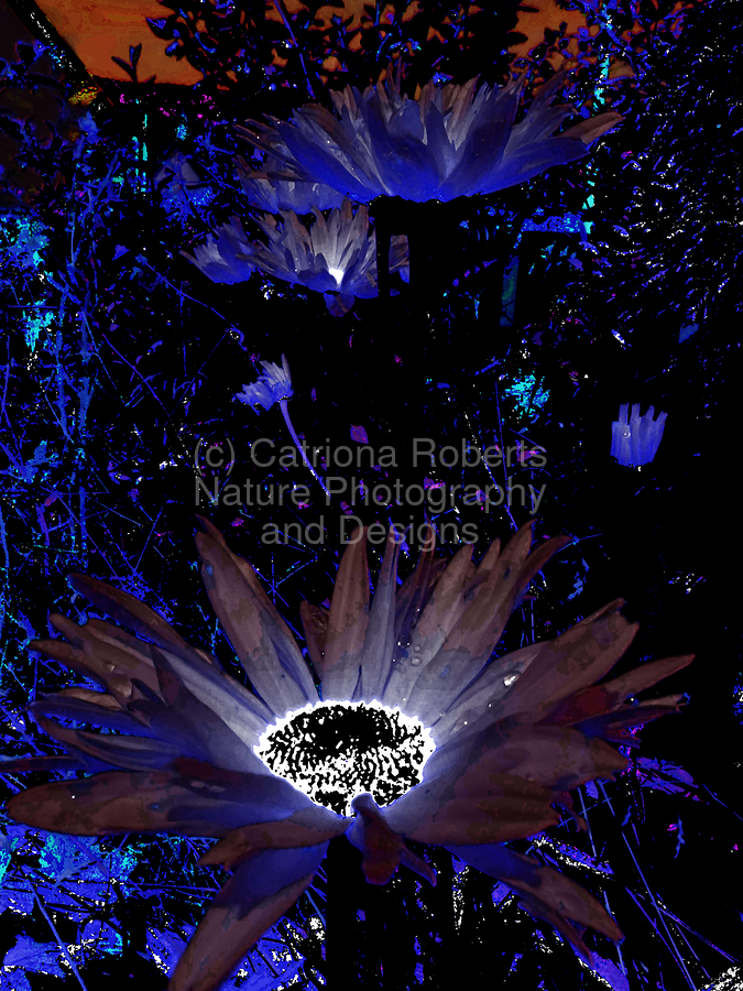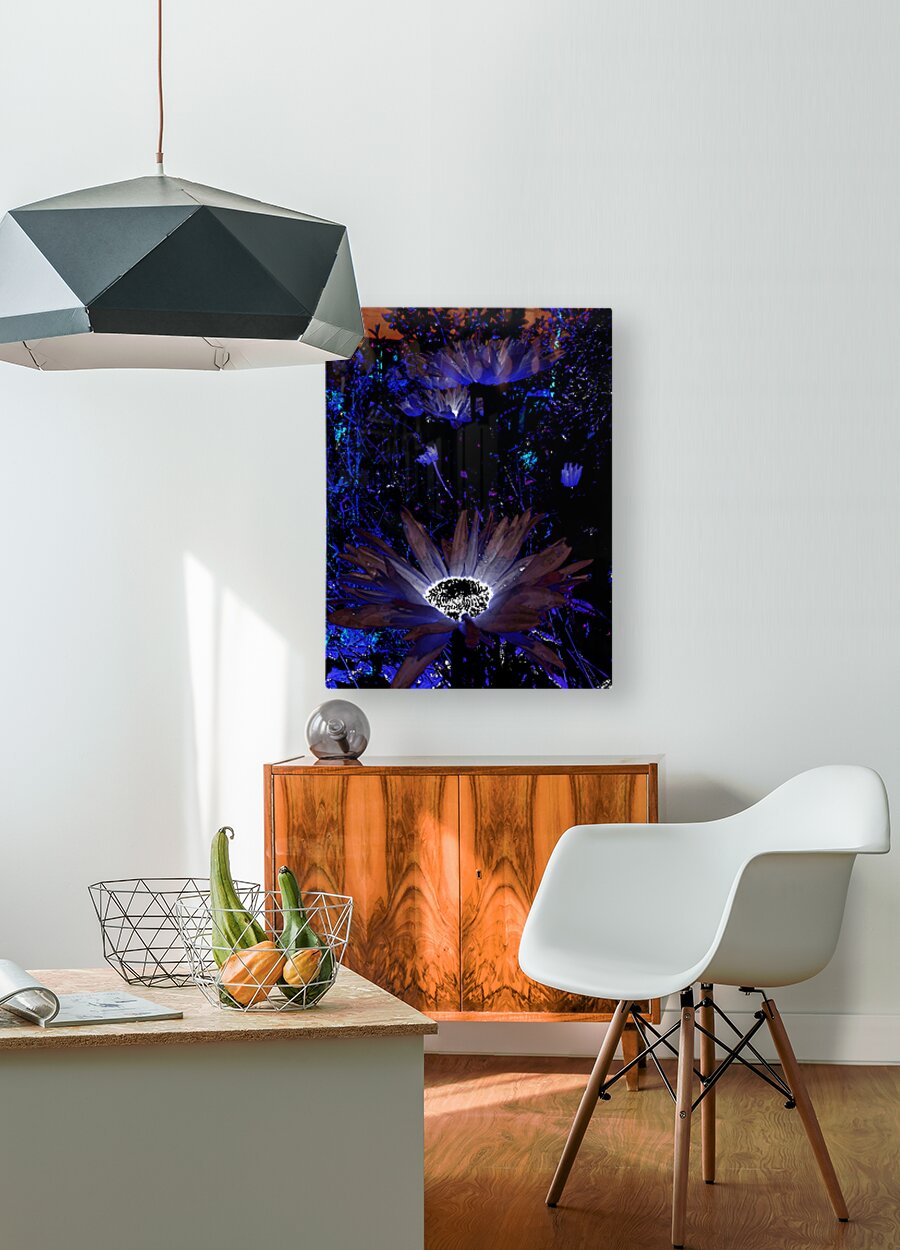 Originally a photo of Daisy flowers laterally digitally manipulated into a stunning piece of contemporary floral art. Features a surreal and vivid color palette, showcasing large Daises with blue and purple hues emerging in a mysterious and dreamlike garden. The illuminated petals contrast starkly against the dark background, creating an ethereal, otherworldly atmosphere.