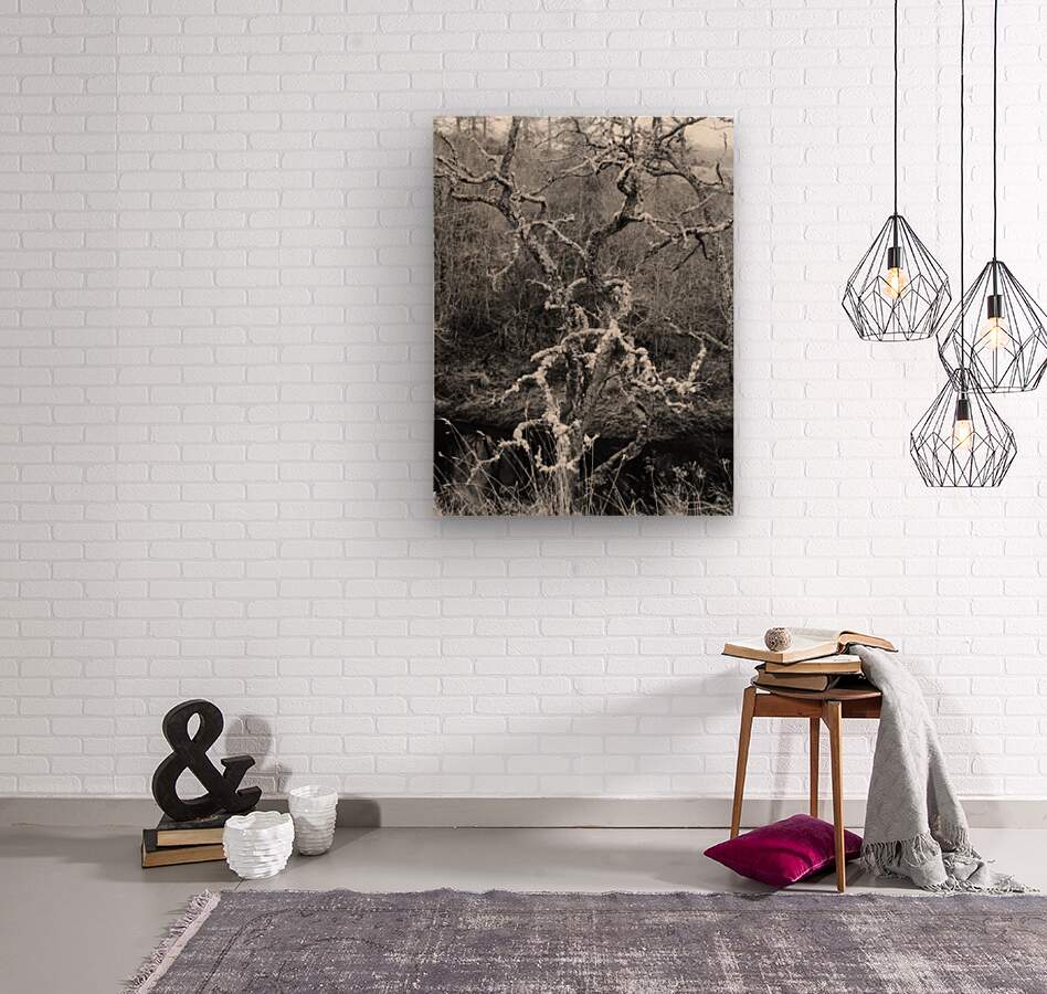 I took this photo during a winter nature walk through the Scottish Highlands. Features a gnarled Birch tree, covered in lichen, standing by a dark, quiet stream. The black and white composition highlights the intricate branches against a backdrop of dense undergrowth.