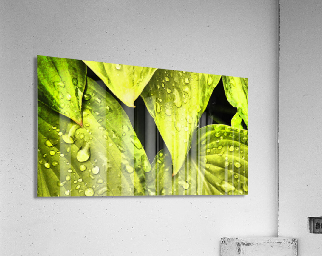 Originally a photo taken using the Intelligent Art photographic filter, laterally digitally manipulated to create a stunning piece of botanical contemporary art. Features vibrant green Hosta leaves adorned with fresh droplets of water, creating a lush and lively scene. The varying shades of green and the detailed water droplets highlight the natural beauty and freshness of the foliage.