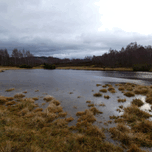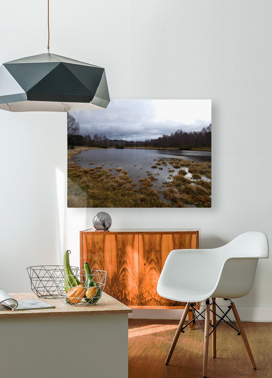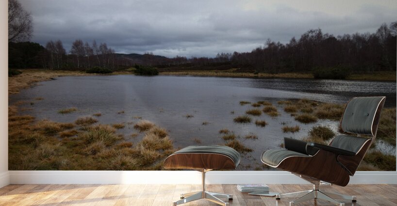 I took this photo during a rather wet and windy winter, nature walk through the Scottish Highlands. Features a serene Lochan surrounded by patches of dry grass and trees, under a cloudy sky. The landscape reflects a calm and overcast atmosphere, with hints of greenery along the edges of the water.