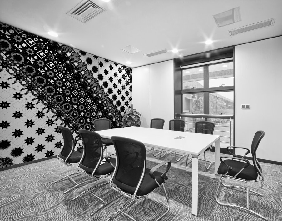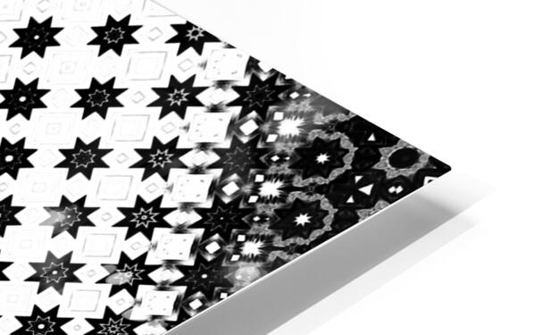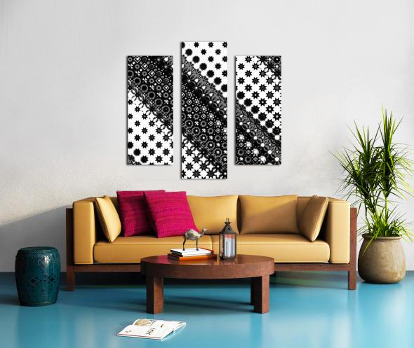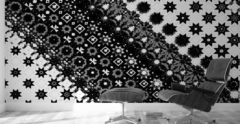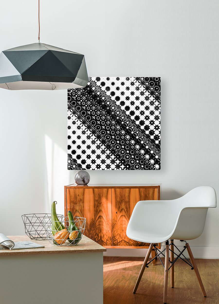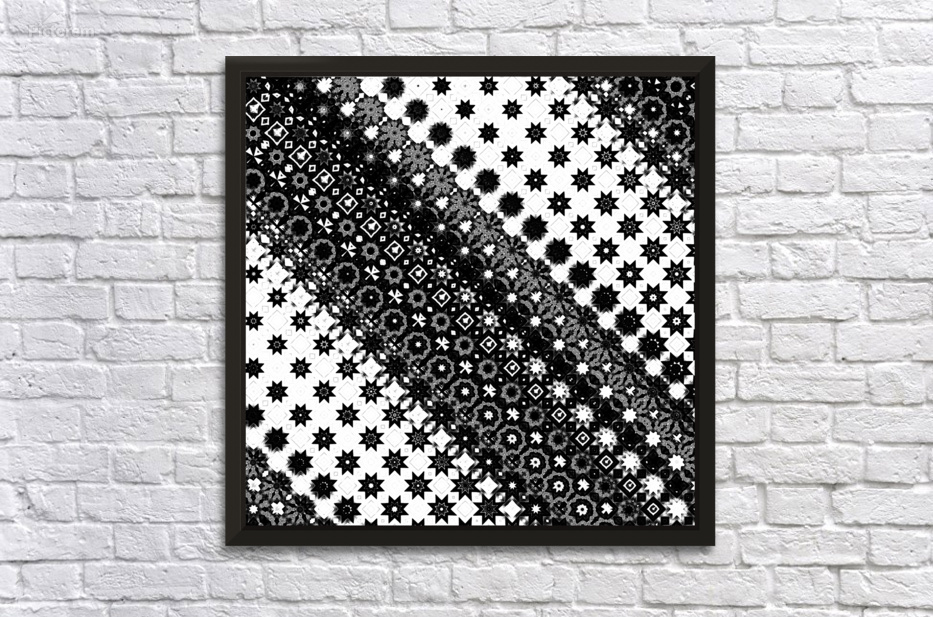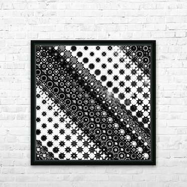 Originally a monochrome design laterally digitally manipulated using various means( including repper.com) enabled this stunning piece of contemporary art work to emerge. Features a black-and-white geometric pattern comprising of a variety of star and diamond shapes, arranged diagonally across the design. The intricate and repeating motif creates a visually striking effect.