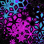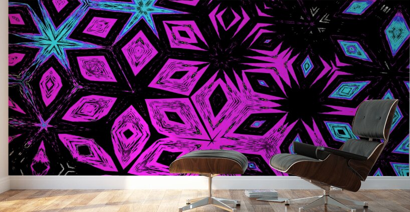 Originally a photo of a cone flower laterally digitally manipulated (using various means including the options within repper.com), enabled this stunning abstract design to emerge. Features vibrant geometric patterns which dominate the scene, featuring a dynamic interplay of pink and blue colors against a dark background. The kaleidoscopic arrangement creates a sense of depth and motion.