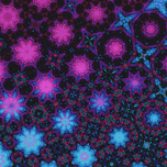 Once a hand painted acrylic and a close up photo of a flower laterally digitally manipulated into a vibrant star-like patterns which dominates the visual, set against a dark background that highlights their neon colours. Each star has a unique colour scheme, ranging from pink and blue to turquoise, creating a kaleidoscopic effect.