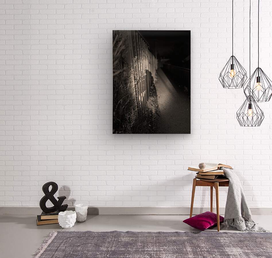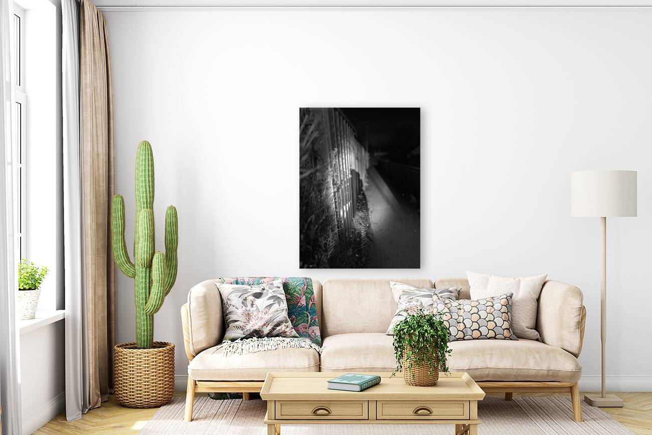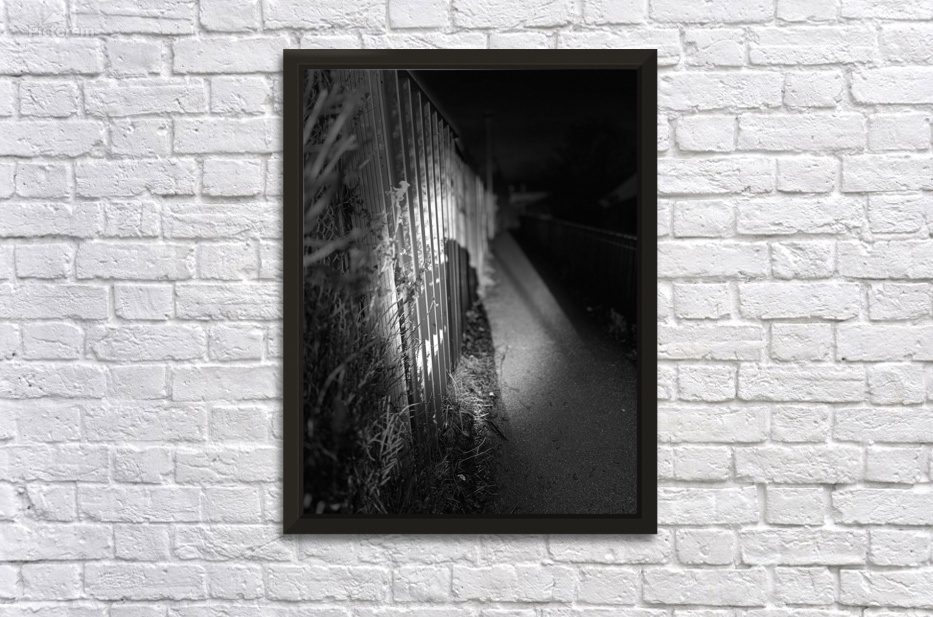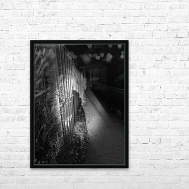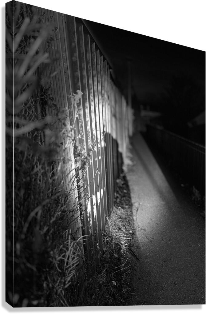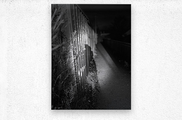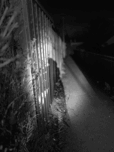 I took this photo during a walk through the Scottish Highlands. Features a dimly lit path stretches alongside a fence at night, with shadows cast by nearby plants under a streetlamp. The scene exudes a moody and mysterious atmosphere.