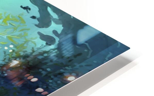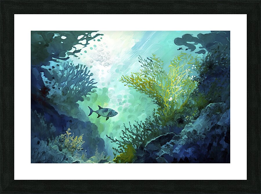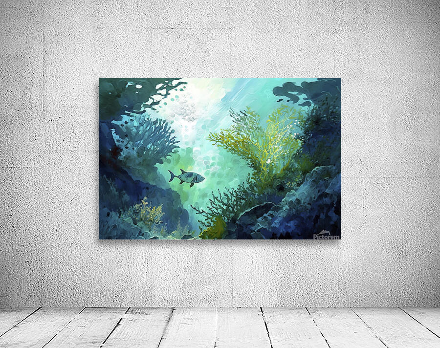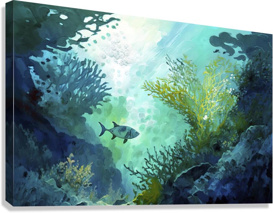 Underwater painting showing a school of fish swimming in a sunlit area of a deep ocean environment. The scene includes rocky formations and thriving u...[+]