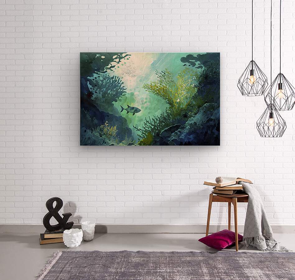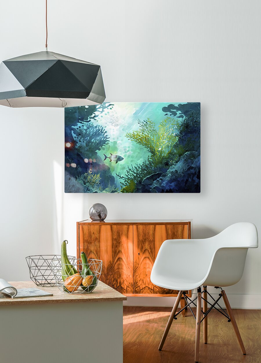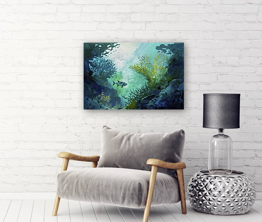 Underwater painting showing a school of fish swimming in a sunlit area of a deep ocean environment. The scene includes rocky formations and thriving underwater plant life, like seaweed and coral, creating a vibrant and detailed ecosystem. A shaft of light from the surface dramatically illuminates the center of the artwork, contrasting with the darker, deeper areas. Produced specifically by DeepEarth Photography for use in the hospitality industry. No warranties are stated or implied. Credits: DeepEarth Photography