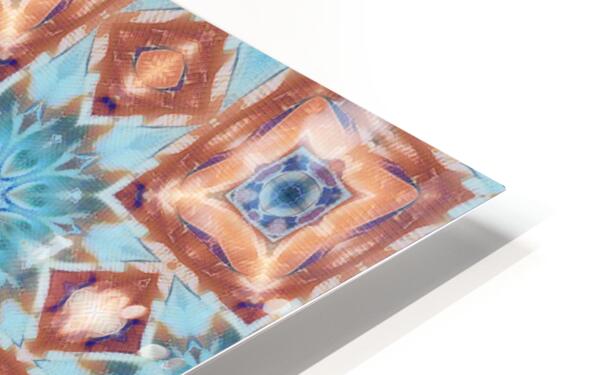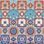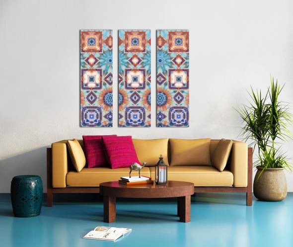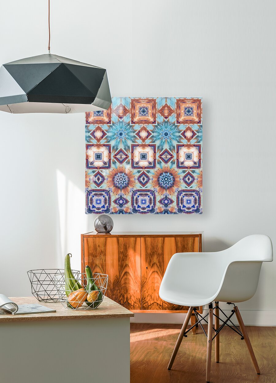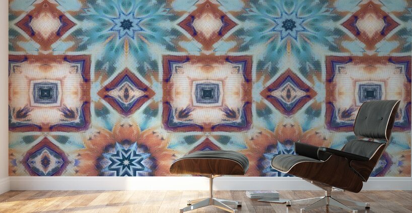 Originally a hand painted acrylic and a close up photo of a flower laterally digitally combined and further digitally enhanced using various means including repper.com enabled this stunning contemporary design to emerge. A vibrant pattern showcases a series of geometric shapes and floral motifs arranged in a symmetrical layout. Muted colors of blue, rust, and teal create an intricate and harmonious design.