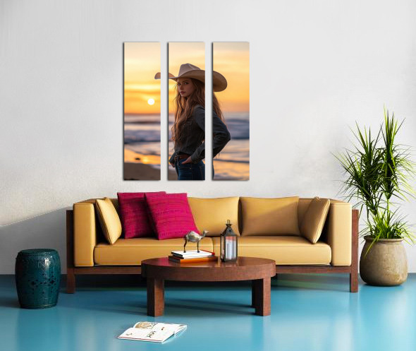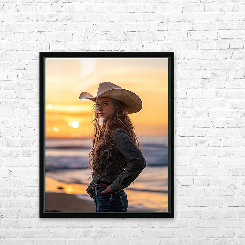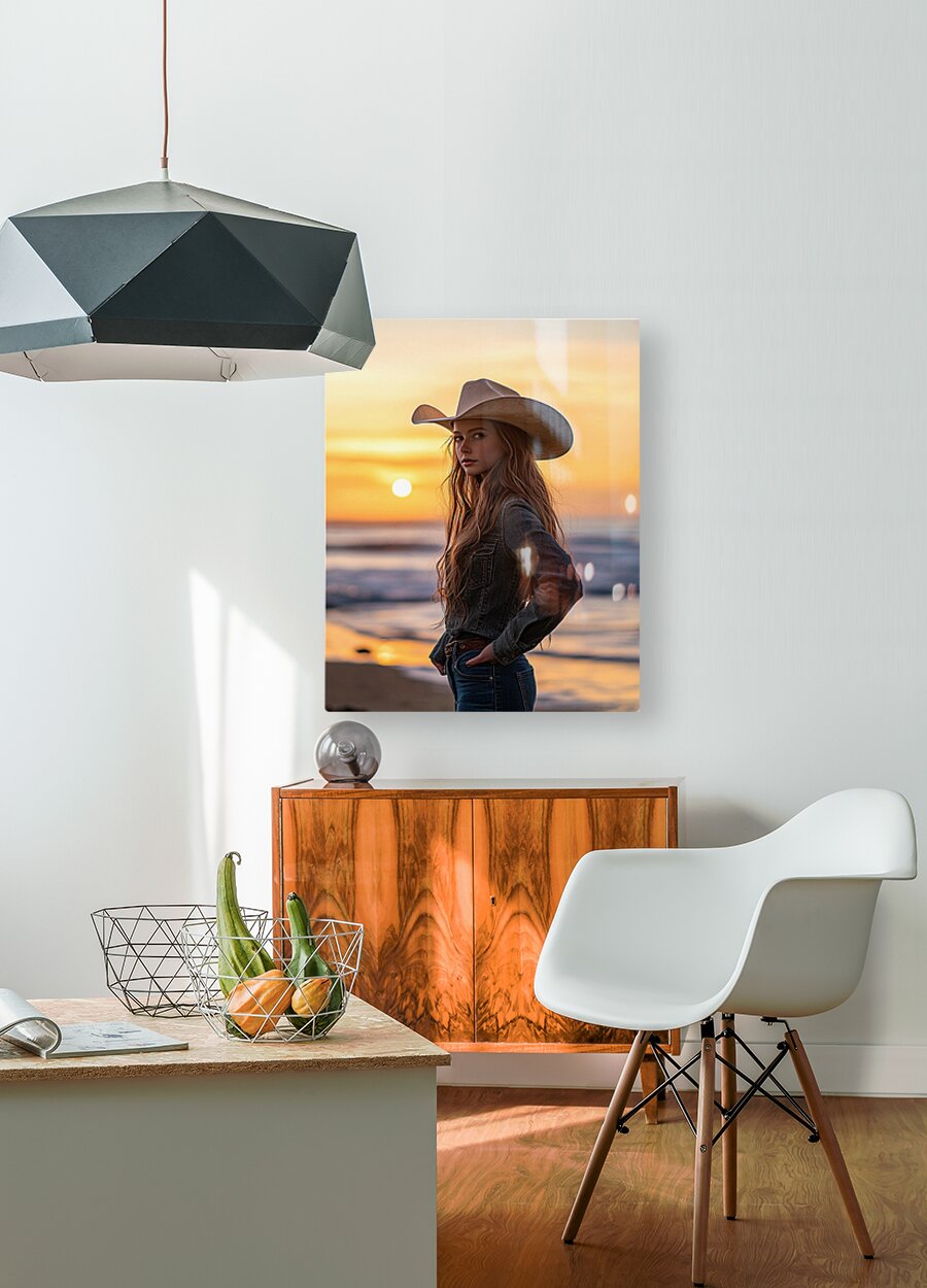 Emma May was a child of two worlds—born into a family of ranchers in the heart of Texas but drawn to the mysteries of the ocean whenever her family would take their rare trips to the coast. The youngest of three siblings, Emma always felt different, as though she carried the restless spirit of an adventurer while still being tethered to the land she called home. Growing up, Emma’s days were spent tending to the family’s cattle, riding her horse Thunder along the trails, and learning the ranch’s traditions passed down for generations. But her favorite moments were the quiet evenings when she’d climb to the highest hill on the ranch to watch the sun dip below the horizon. That was when she’d dream of something more—something that lay beyond the rolling pastures and dirt roads. At 21, Emma’s love for the sunset led her to take a bold step. She left the ranch for the first time on her own and drove west until the land met the sea. That’s where she found the blend of her two loves—wide-open spaces and the freedom of the ocean. This photo captures Emma May during one of her favorite rituals: standing at the edge of the world as the day gives way to twilight. Wearing her signature cowboy hat, denim jacket, and weathered belt, Emma May looks out at the horizon, a soft smile tugging at her lips. Her expression holds the confidence of a woman who knows her roots and the determination of someone who’s not afraid to explore new horizons. The waves crash behind her, and the scent of salt and seaweed fills the air, mingling with the faint leather of her jacket. Despite being far from her ranch, Emma hasn’t let go of her cowboy spirit. She’s found a way to bridge her two worlds, helping run horseback tours along the coastline and sharing stories of her life in the heartland. The sunsets here remind her of home but also fuel her dream of traveling further—to deserts, mountains, and places she’s only read about in books. Emma May’s story is one of resilience, wanderlust, and balance. She’s living proof that you can carry your heritage with you while chasing new dreams. As the sun dips lower into the sea, painting the sky in hues of orange and gold, Emma stands tall—a cowgirl at heart, embracing the endless possibilities that stretch before her.
