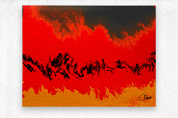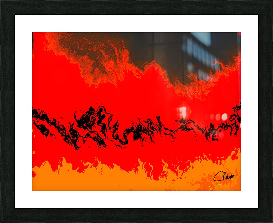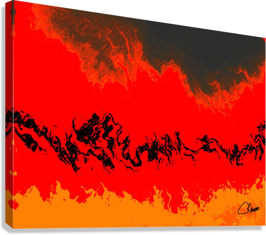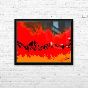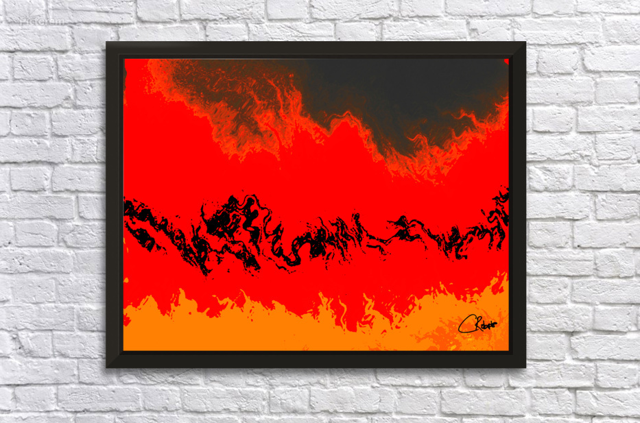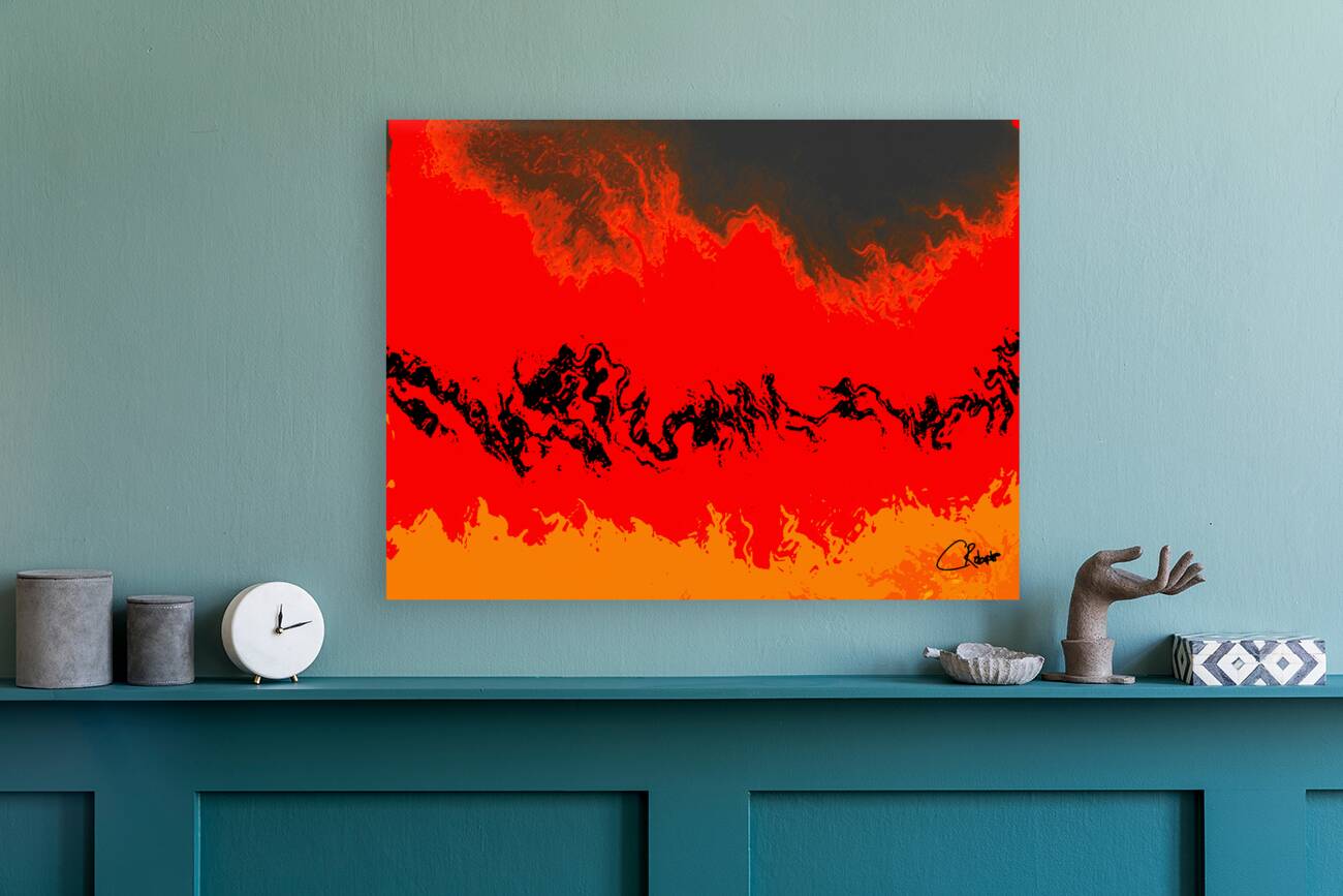 I originally took an abstract photo of a winter forest , laterally digitally manipulating this into a stunning piece of contemporary abstract art. Features vibrant red and orange hues which dominate the composition, creating a fiery landscape accented by swirling black forms. The abstract nature evokes a sense of movement and energy, as the colors blend seamlessly across the scene.
