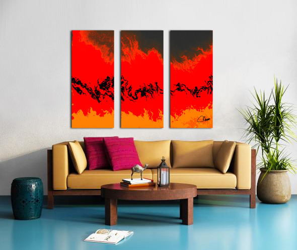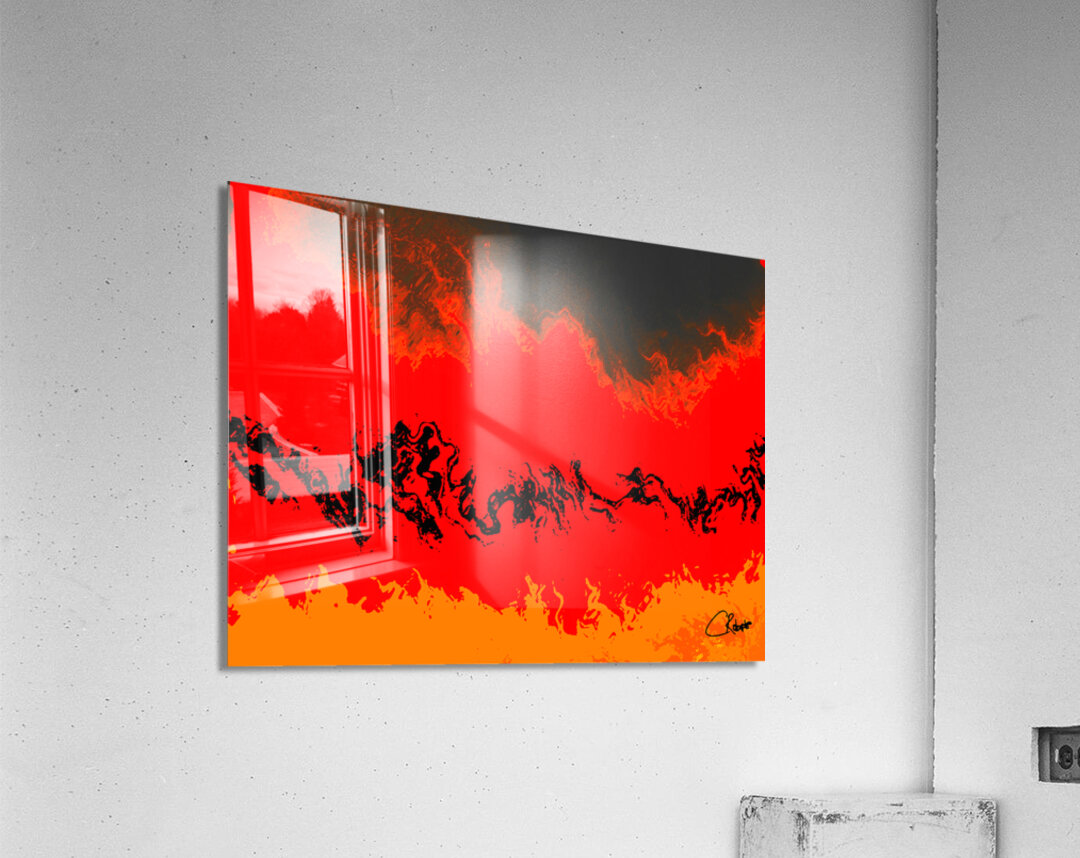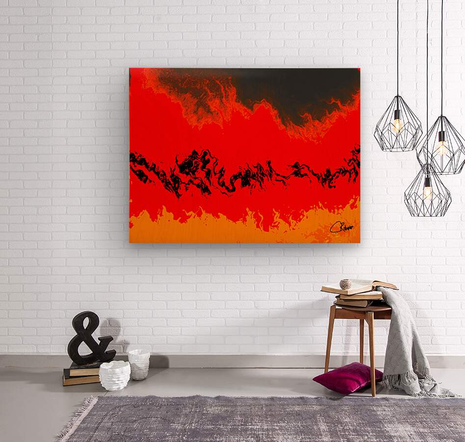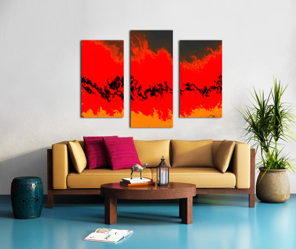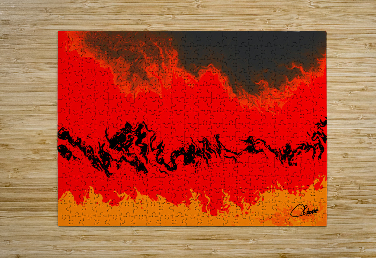 I originally took an abstract photo of a winter forest , laterally digitally manipulating this into a stunning piece of contemporary abstract art. Features vibrant red and orange hues which dominate the composition, creating a fiery landscape accented by swirling black forms. The abstract nature evokes a sense of movement and energy, as the colors blend seamlessly across the scene.