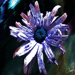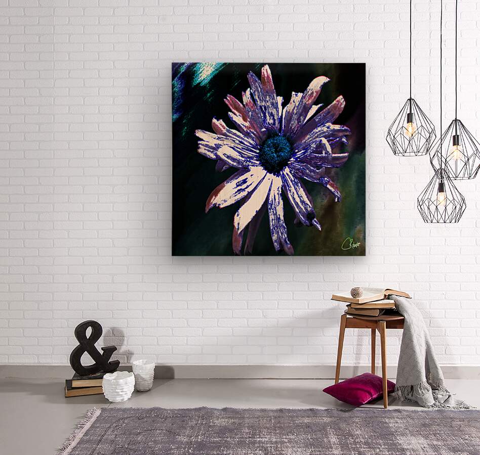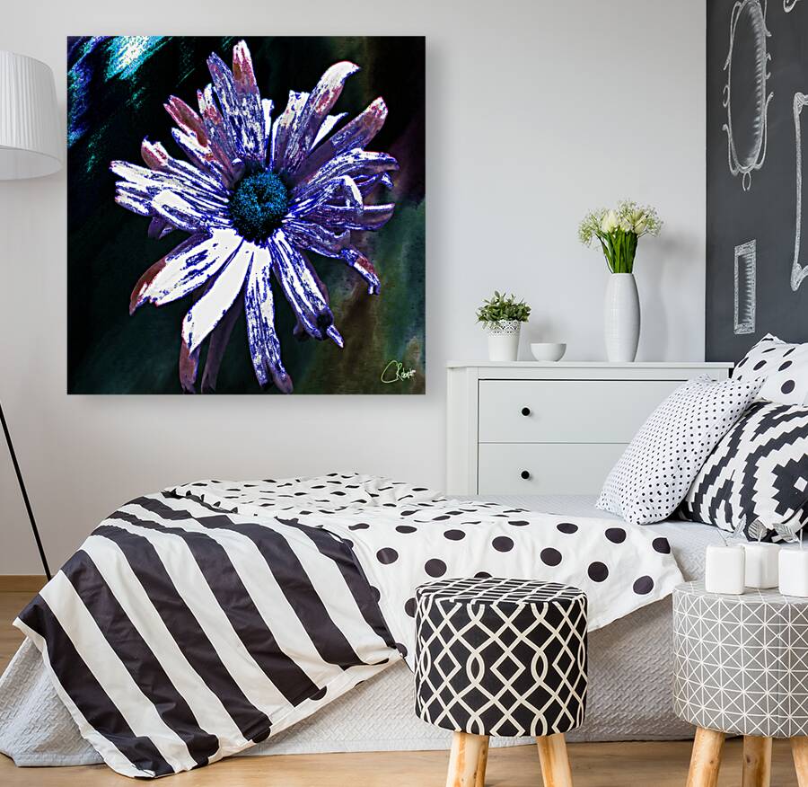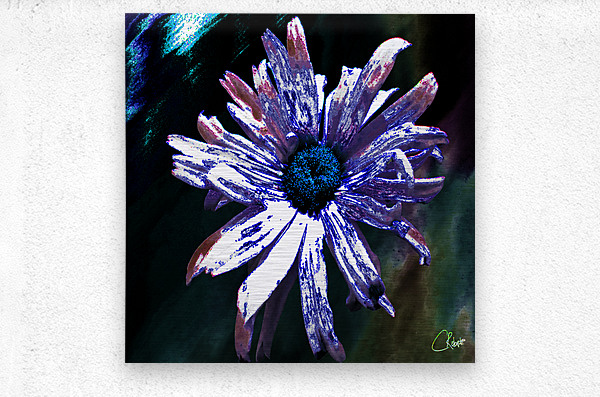 riginally a close up photo of a Daisy flower and a hand painted acrylic laterally digitally manipulated and combined to create this stunning piece of contemporary floral art. Features a vibrant Daisy with splashes of blue and white which dominates the composition, set against a dark, abstract background. The petals appear dynamic and textured, drawing focus to the intricate center of the bloom.